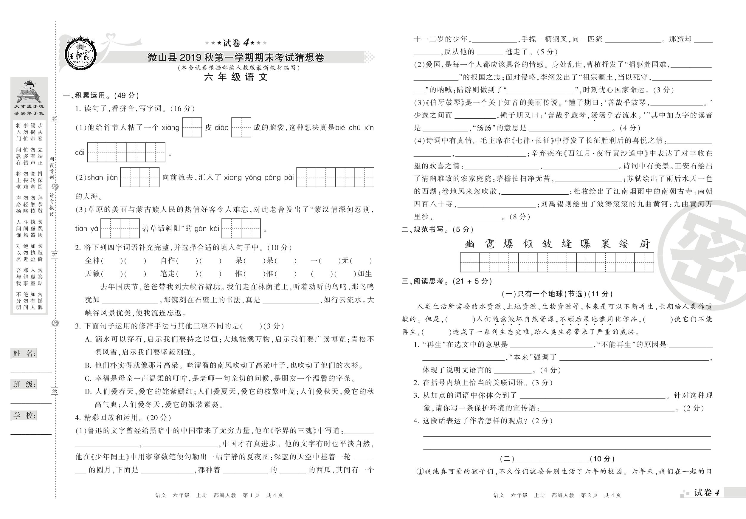 2019-2020学年第一学期济宁市微山县猜想卷六年级语文试卷(人教版)【4】
