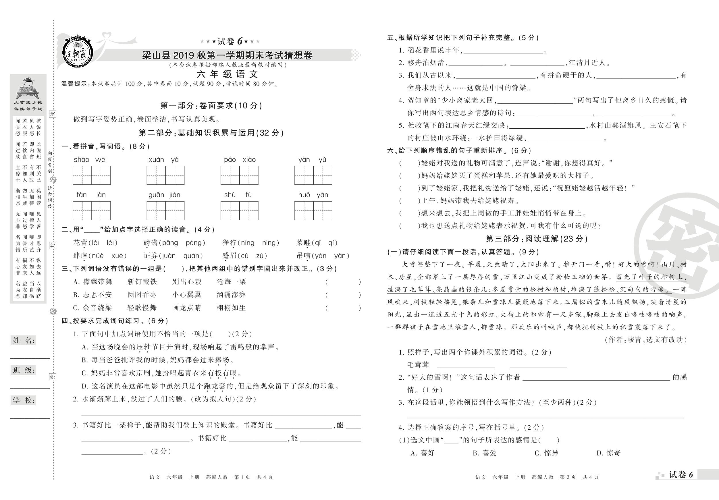 2019-2020学年第一学期济宁市梁山县猜想卷六年级语文试卷(人教版)【6】