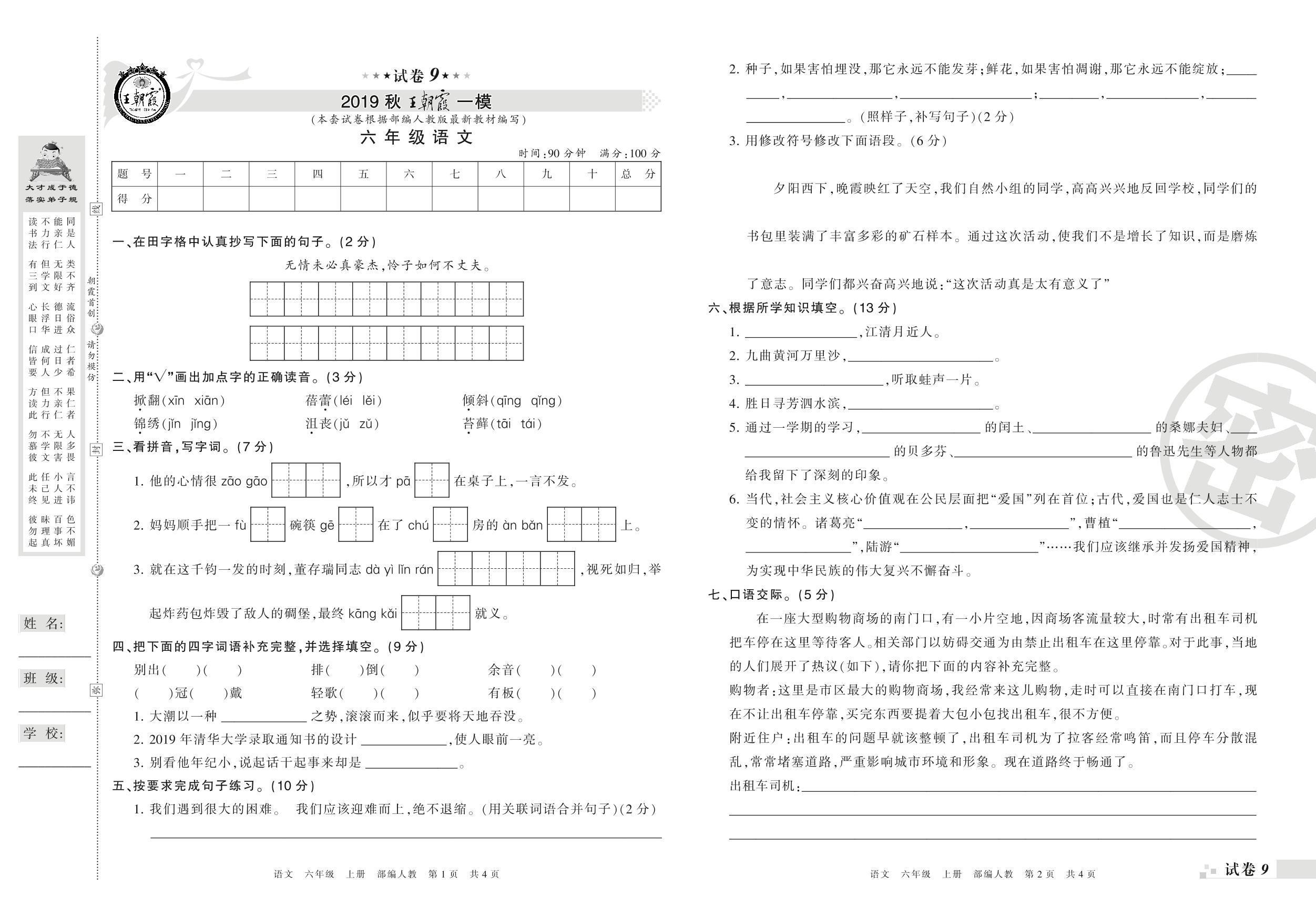 王朝霞期末模拟卷六年级上册语文(人教版)_R21080233242【9】