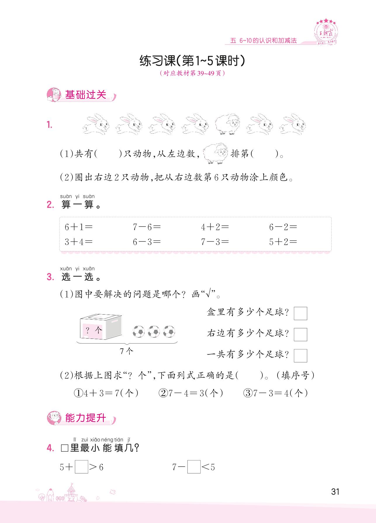 2022上册一年级数学人教版 五 6~10的认识和加减法——练习课(第1~5课时)