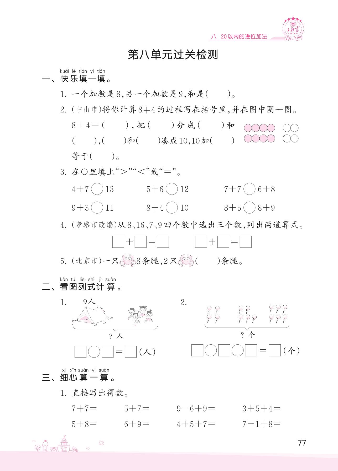 2022上册一年级数学人教版 八 20以内的进位加法——第八单元过关检测