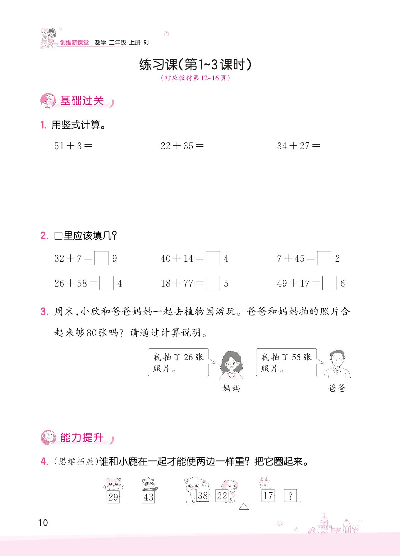 2022上册二年级数学人教版 二 100以内的加法和减法(二)——练习课(第1~3课时)