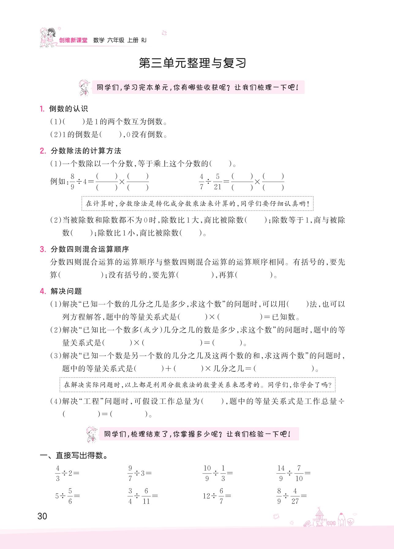 2022上册六年级数学人教版 三 分数除法——第三单元整理与复习