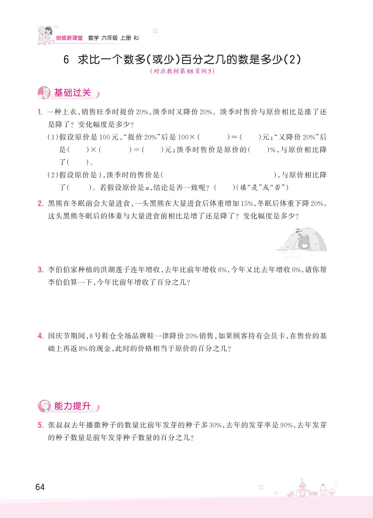 2022上册六年级数学人教版 六 百分数(一)——6 求比一个数多(或少)百分之几的数是多少(2)