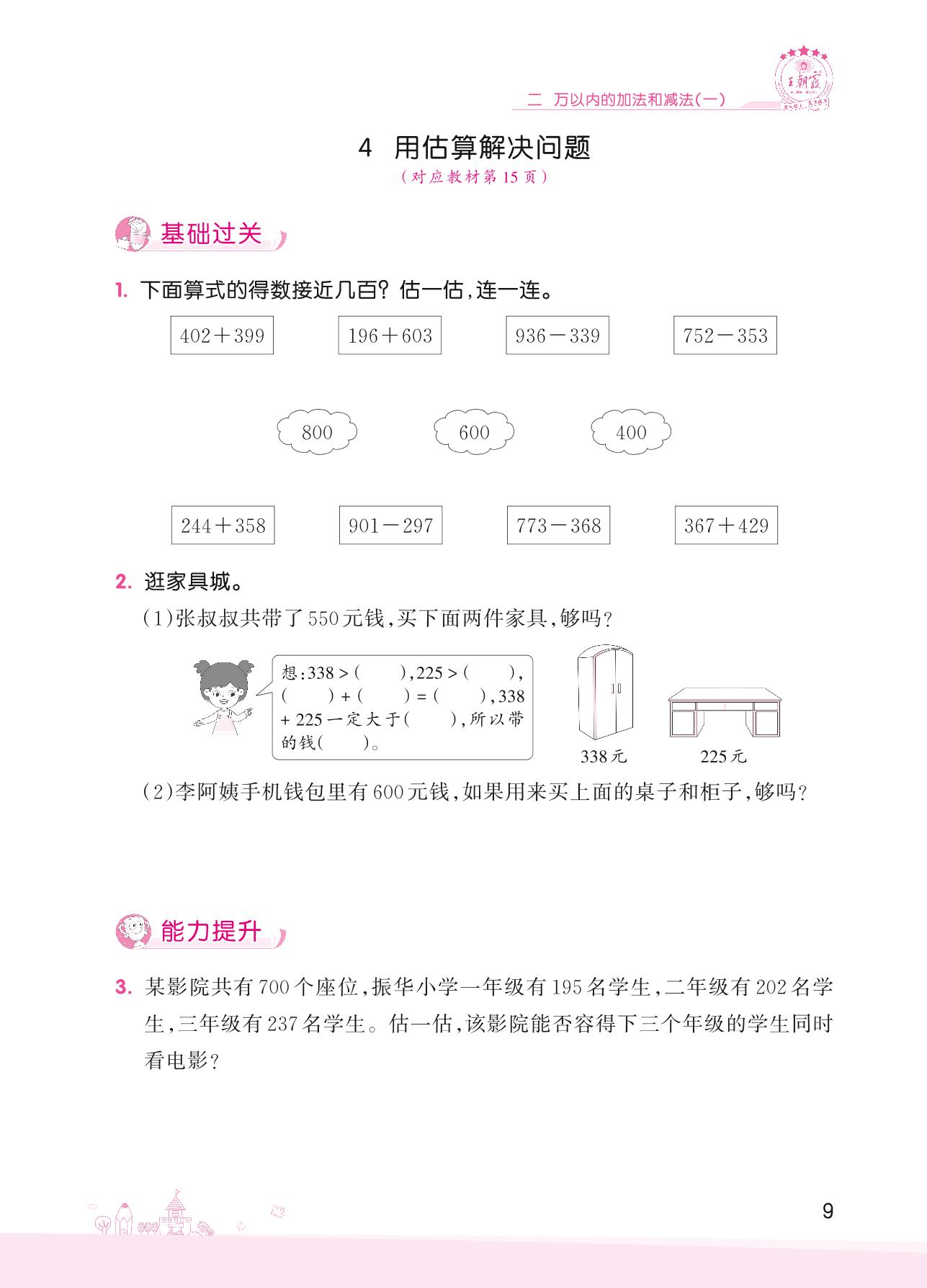2022上册三年级数学人教版 二 万以内的加法和减法(一)——4 用估算解决问题