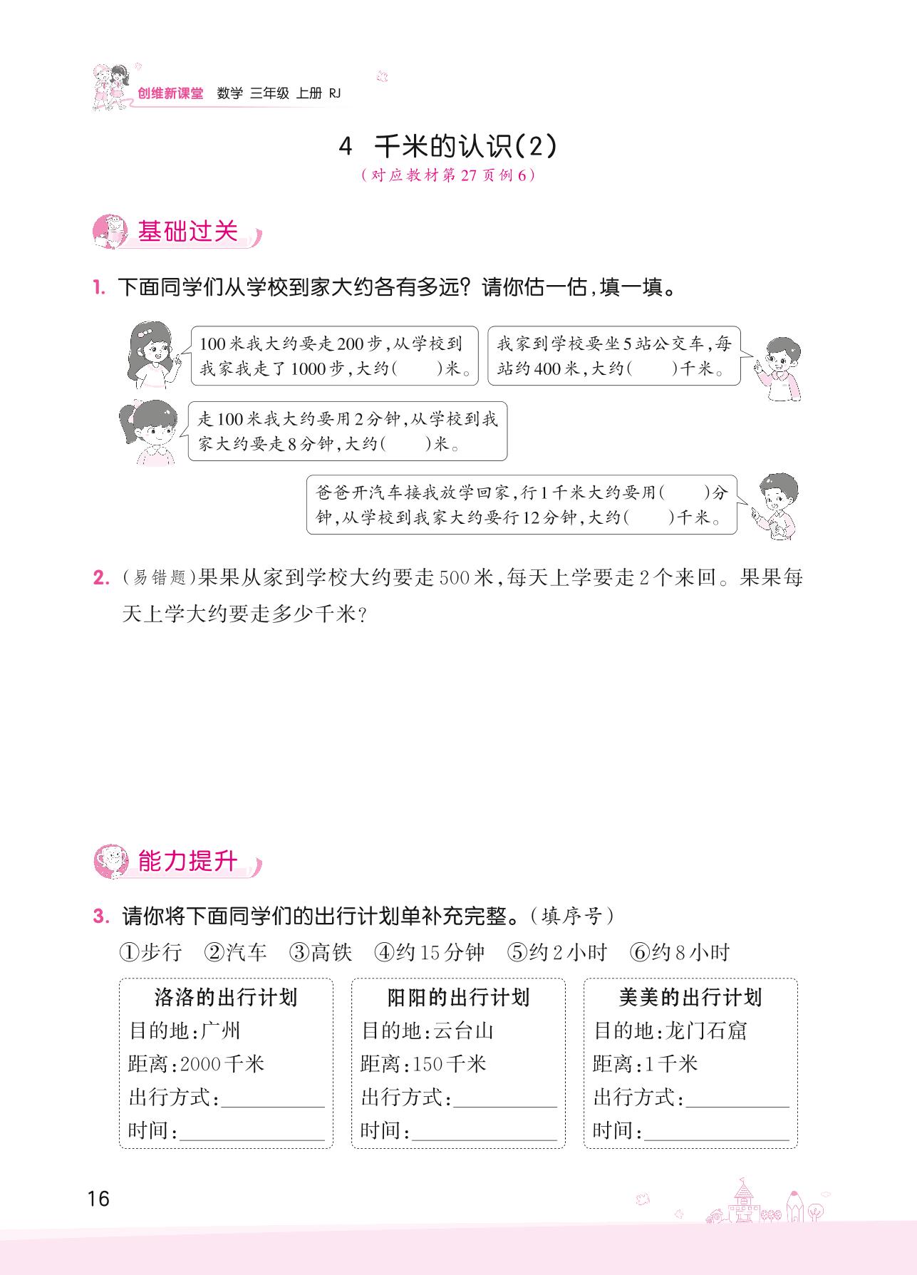 2022上册三年级数学人教版 三 测量——4 千米的认识(2)