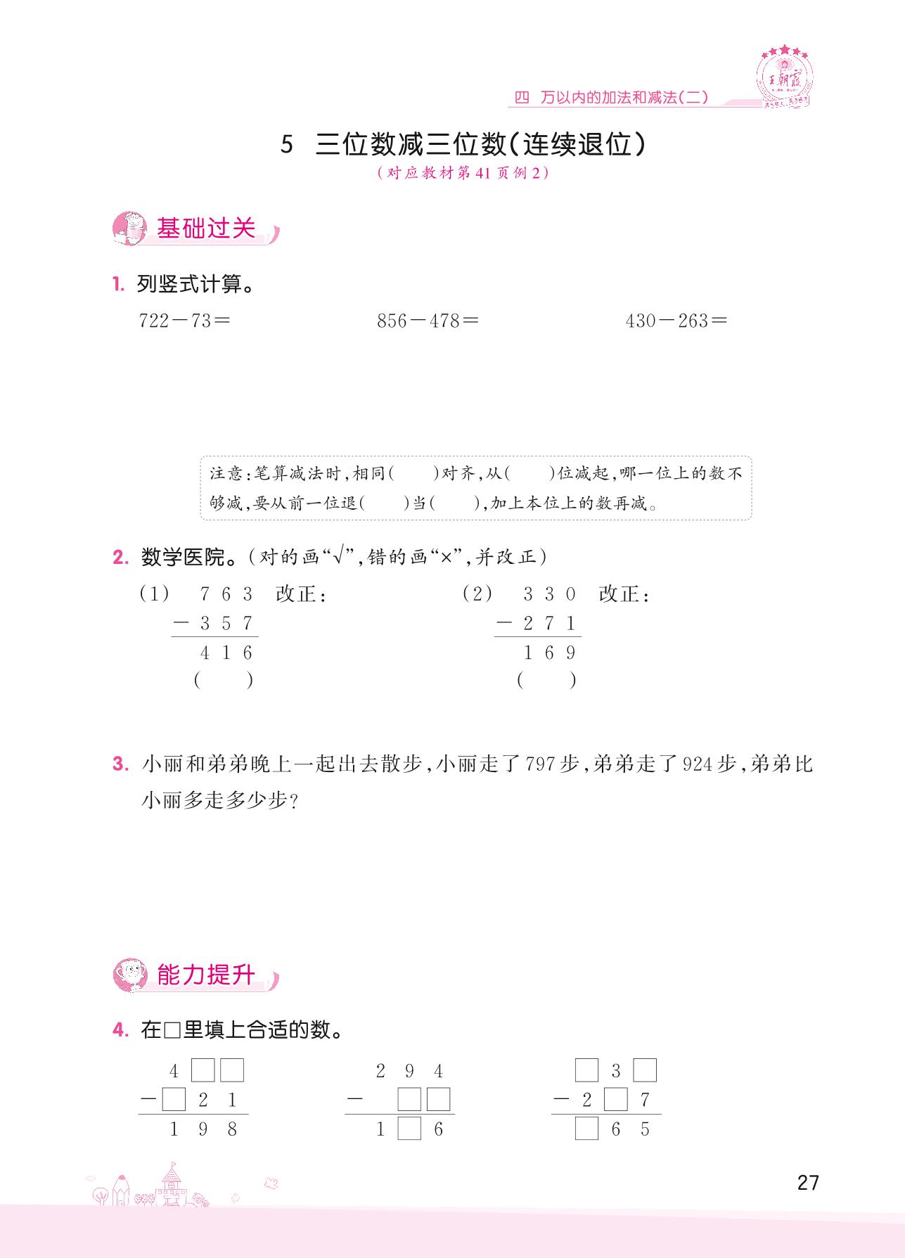 2022上册三年级数学人教版 四 万以内的加法和减法(二)——5 三位数减三位数(连续退位)