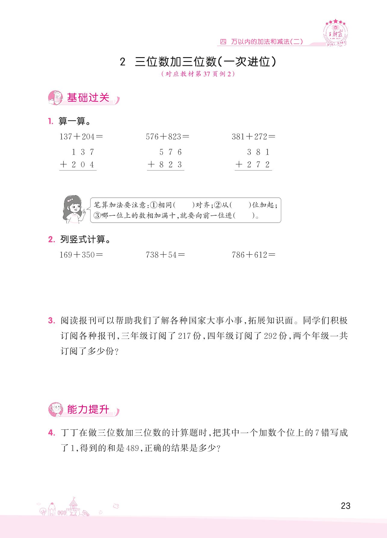 2022上册三年级数学人教版 四 万以内的加法和减法(二)——2 三位数加三位数(一次进位)