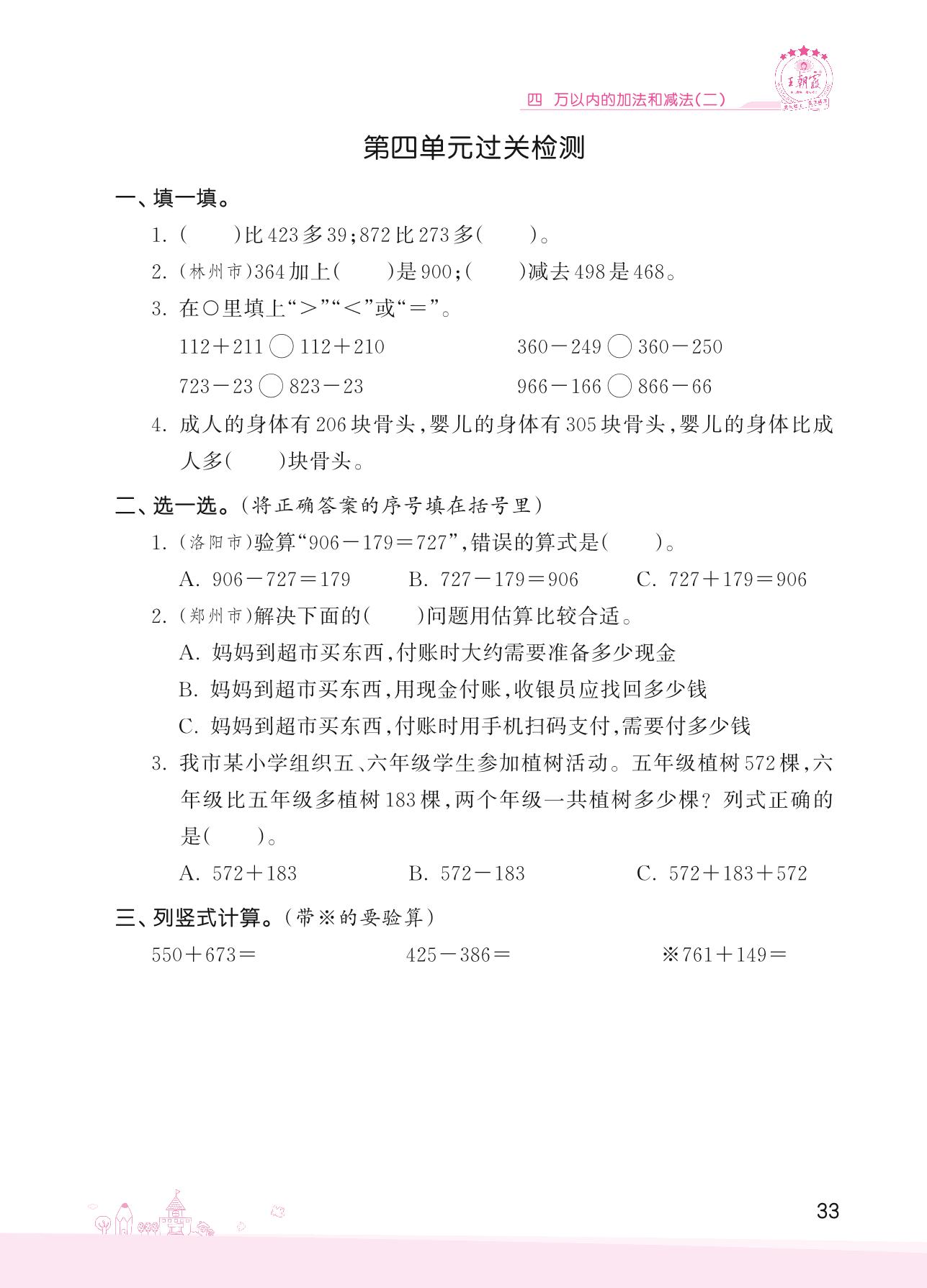 2022上册三年级数学人教版 四 万以内的加法和减法(二)——第四单元过关检测