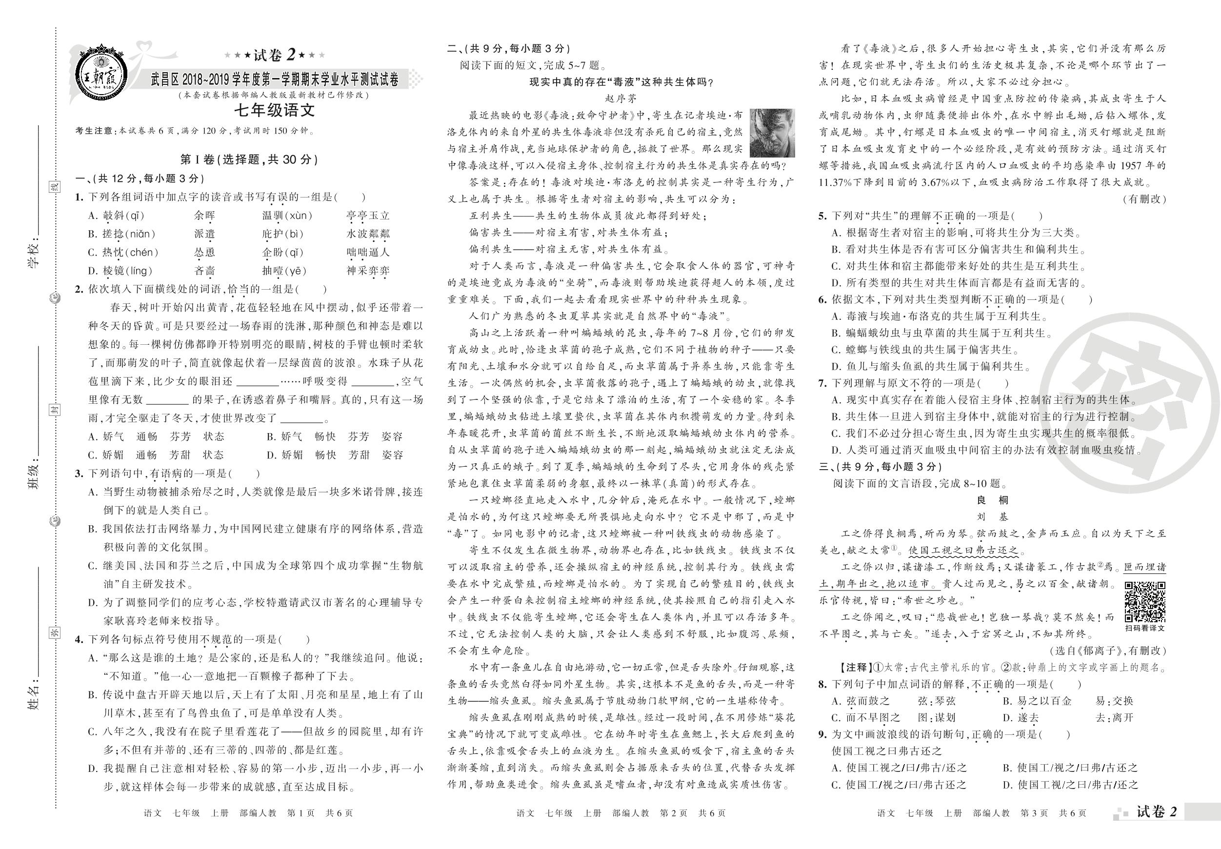 2018-2019学年第一学期武汉市武昌区七年级语文试卷(人教版)【2】
