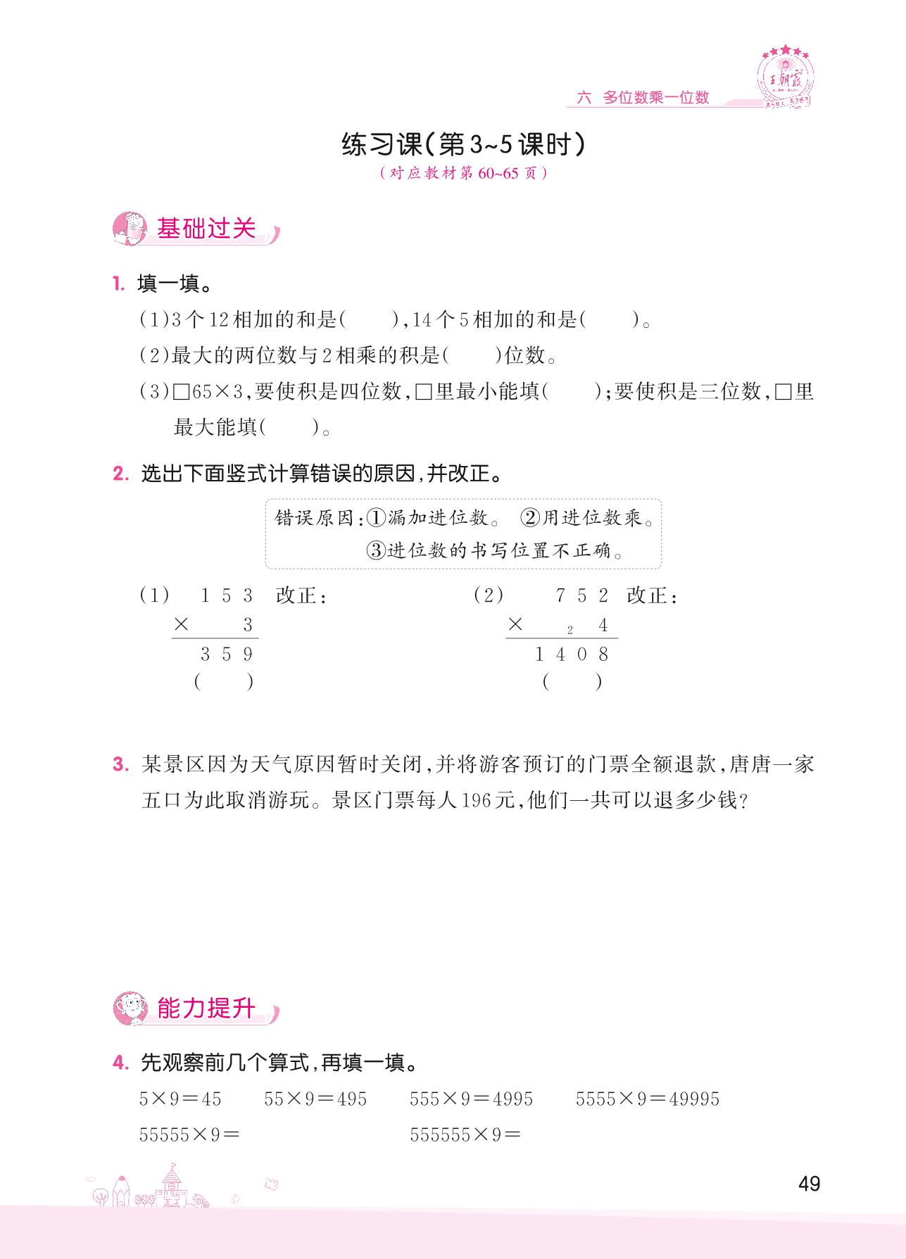 2022上册三年级数学人教版 六 多位数乘一位数——练习课(第3~5课时)