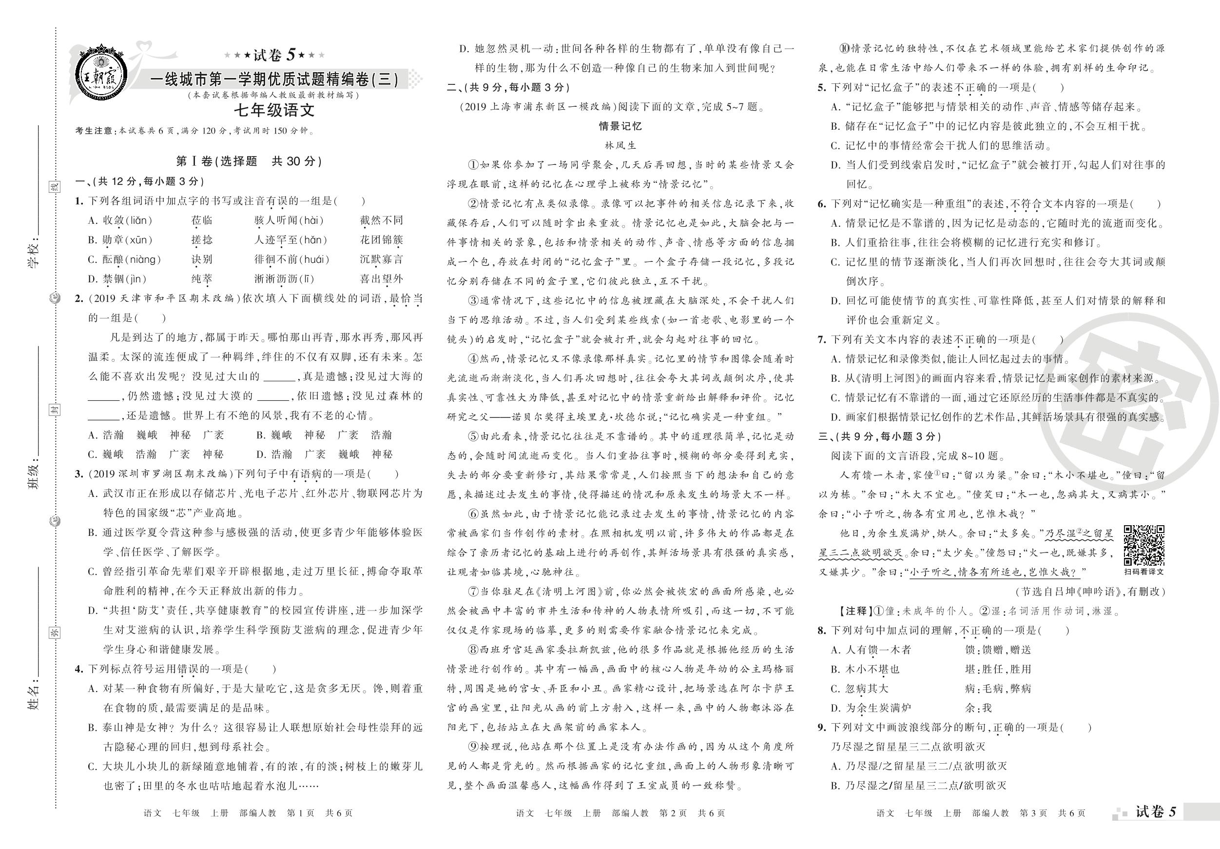 一线城市优质试题精编卷(三)七年级上册语文(人教版)【5】