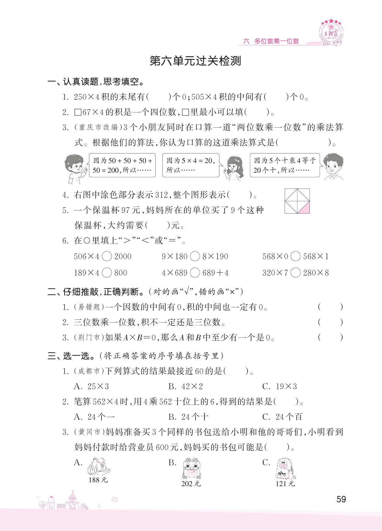 2022上册三年级数学人教版 六 多位数乘一位数——第六单元过关检测
