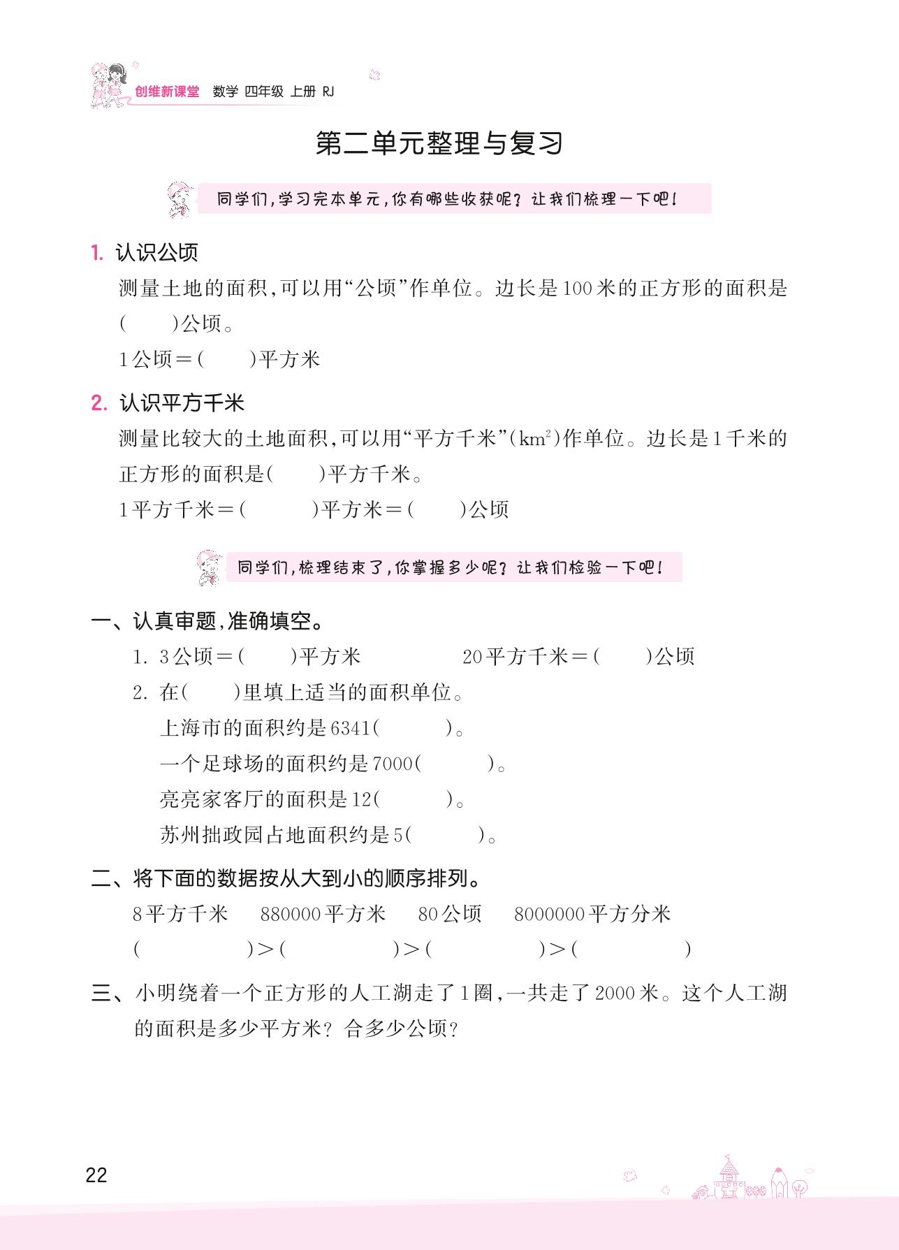 2022上册四年级数学人教版 二 公顷和平方千米——第二单元整理与复习