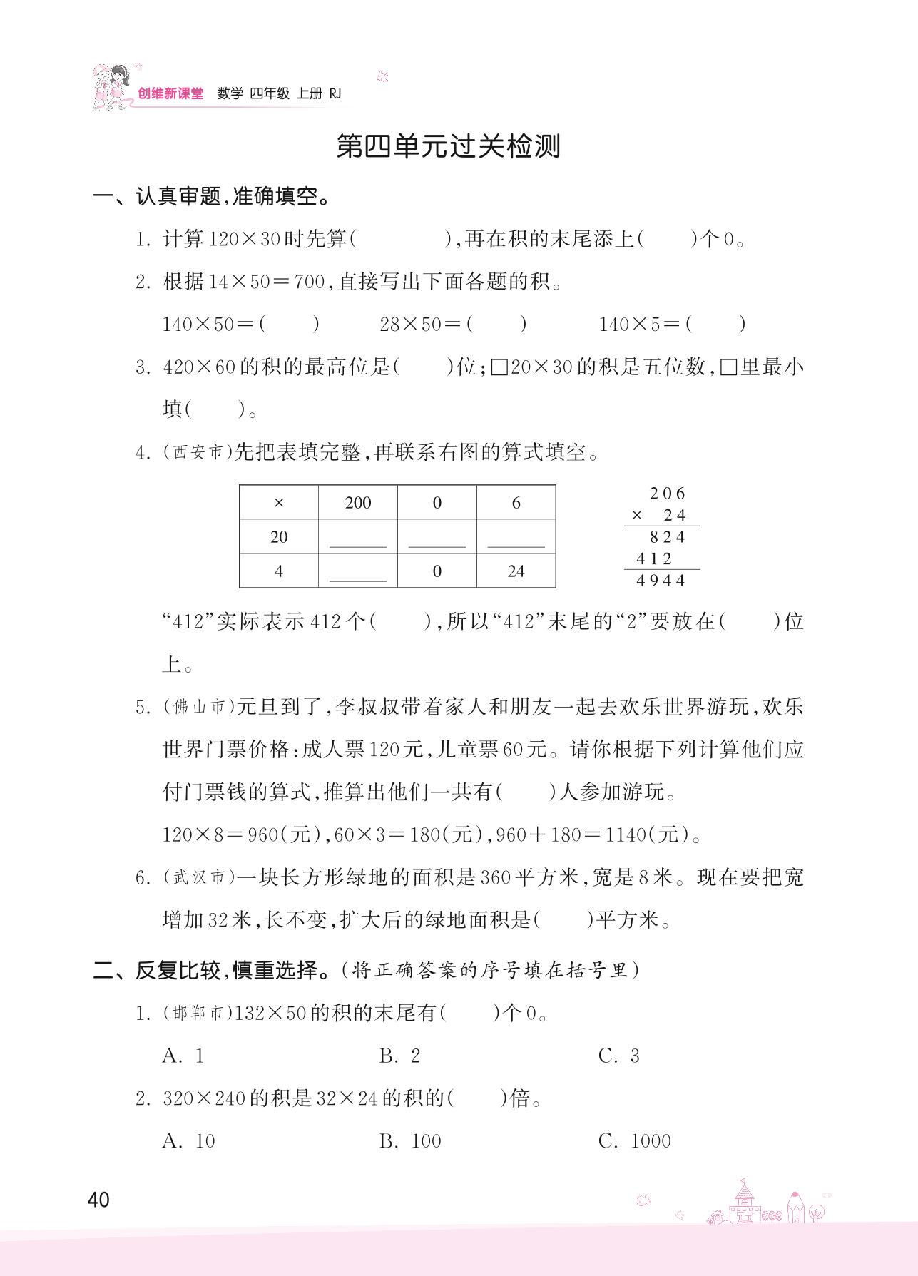 2022上册四年级数学人教版 四 三位数乘两位数——第四单元过关检测
