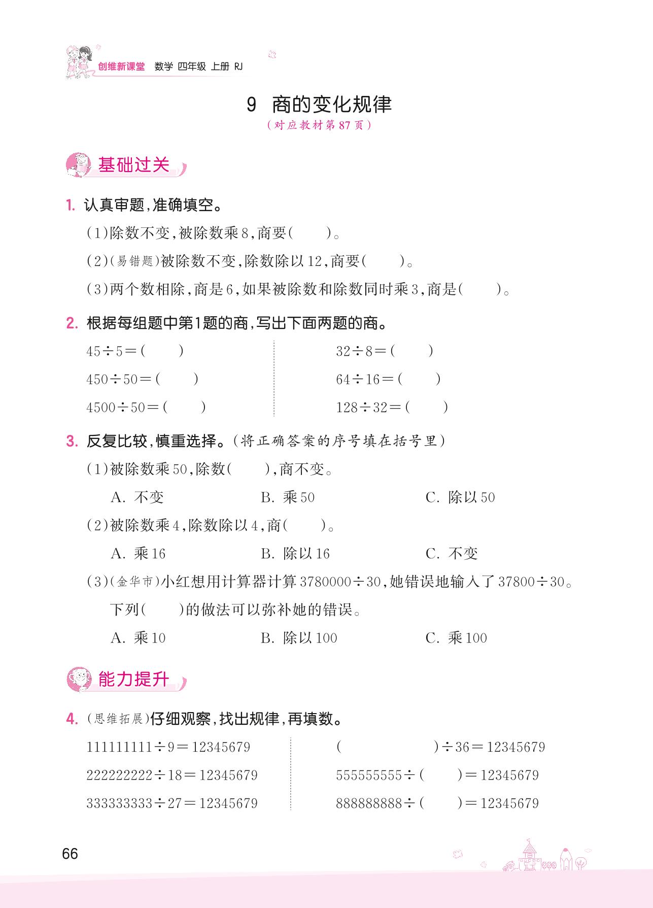 2022上册四年级数学人教版 六 除数是两位数的除法——9 商的变化规律
