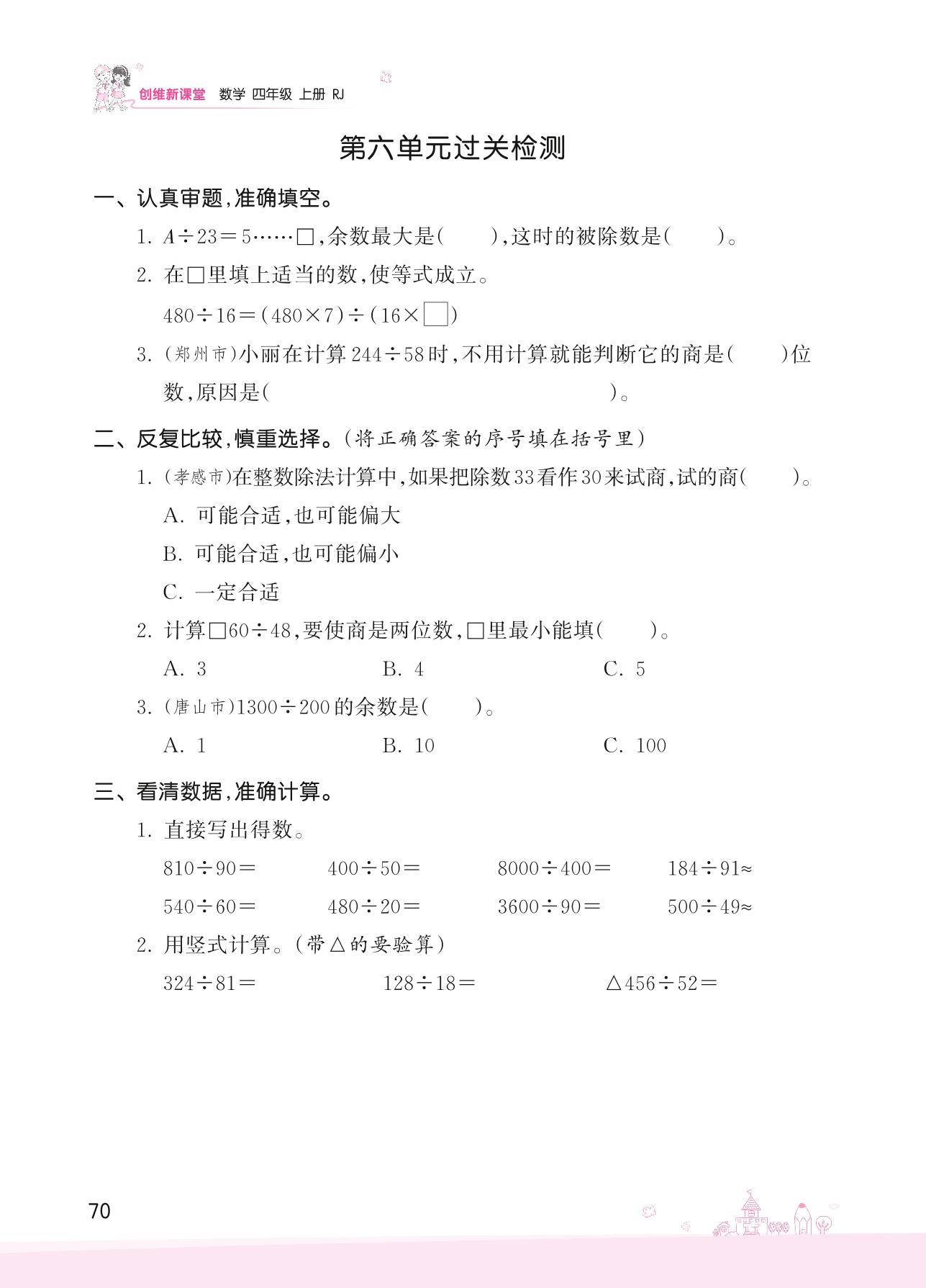 2022上册四年级数学人教版 六 除数是两位数的除法——第六单元过关检测