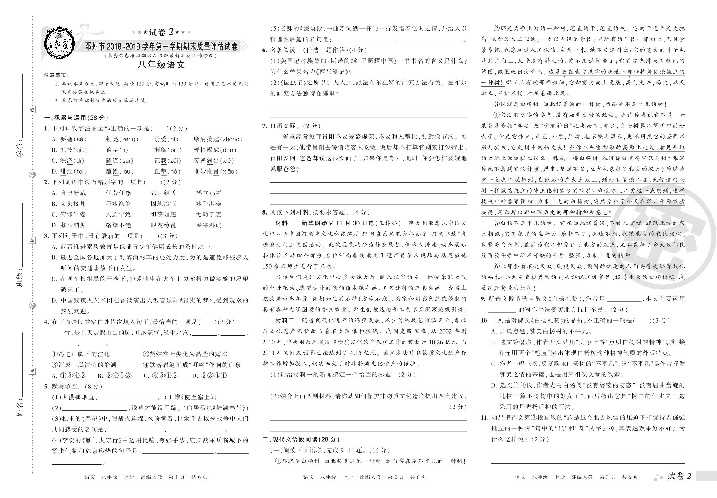 2018-2019学年第一学期邓州市八年级语文试卷(人教版)【2】