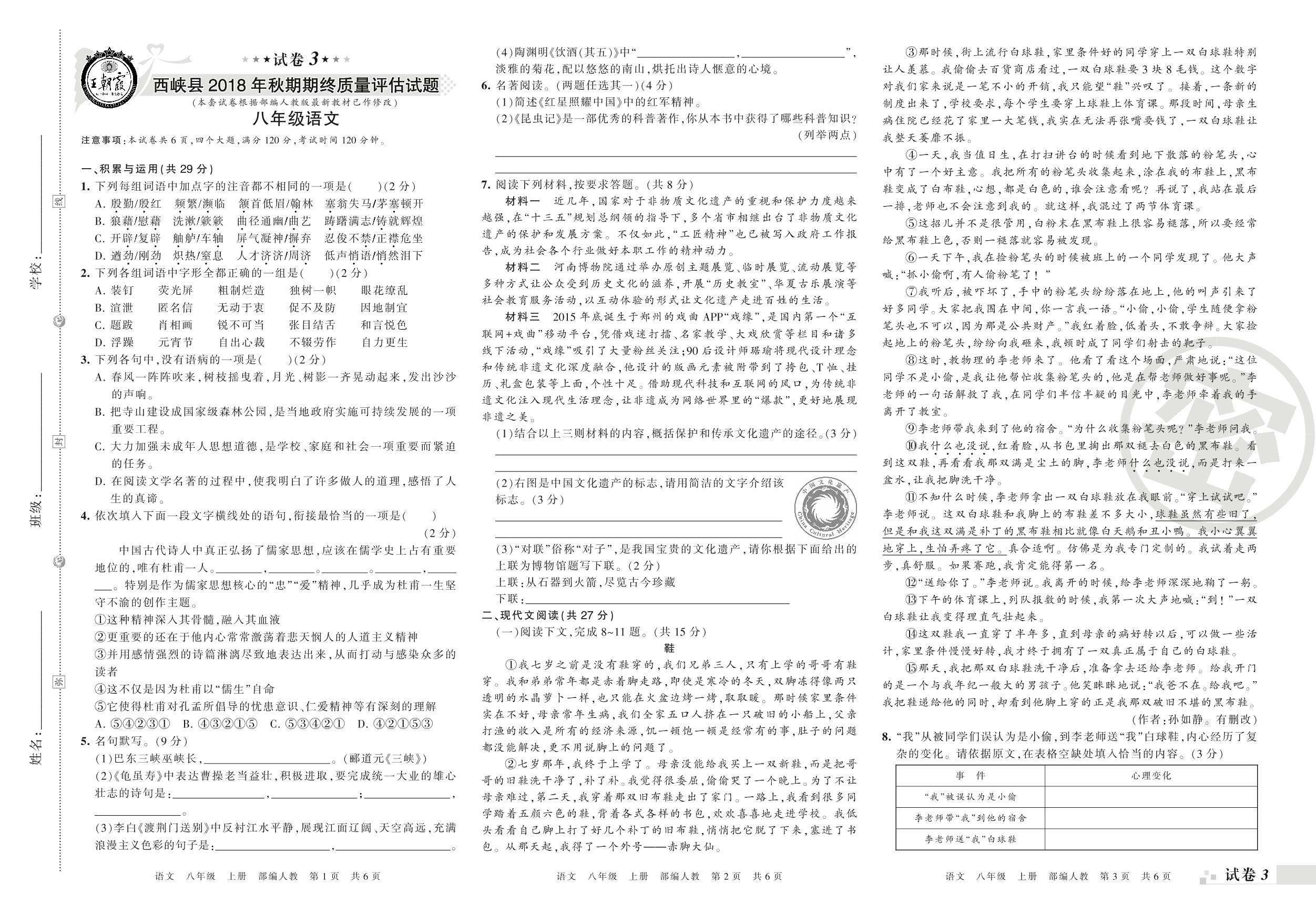 2018-2019学年第一学期南阳市西峡县八年级语文试卷(人教版)【3】