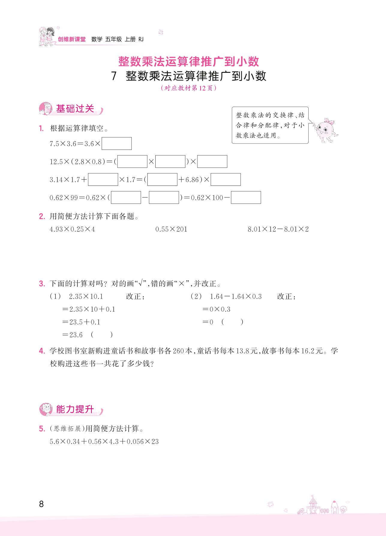 2022上册五年级数学人教版 一 小数乘法——7 整数乘法运算律推广到小数