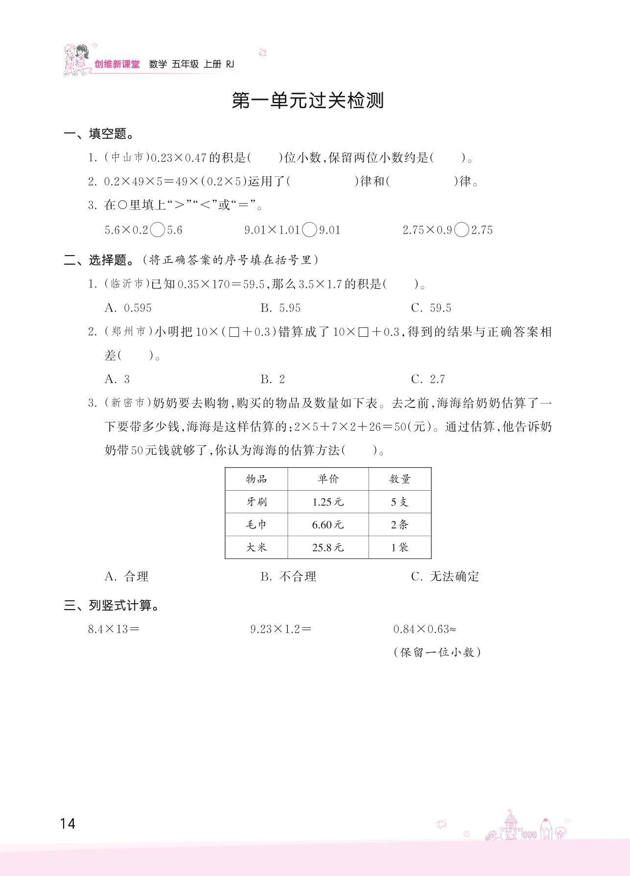2022上册五年级数学人教版 一 小数乘法——第一单元过关检测