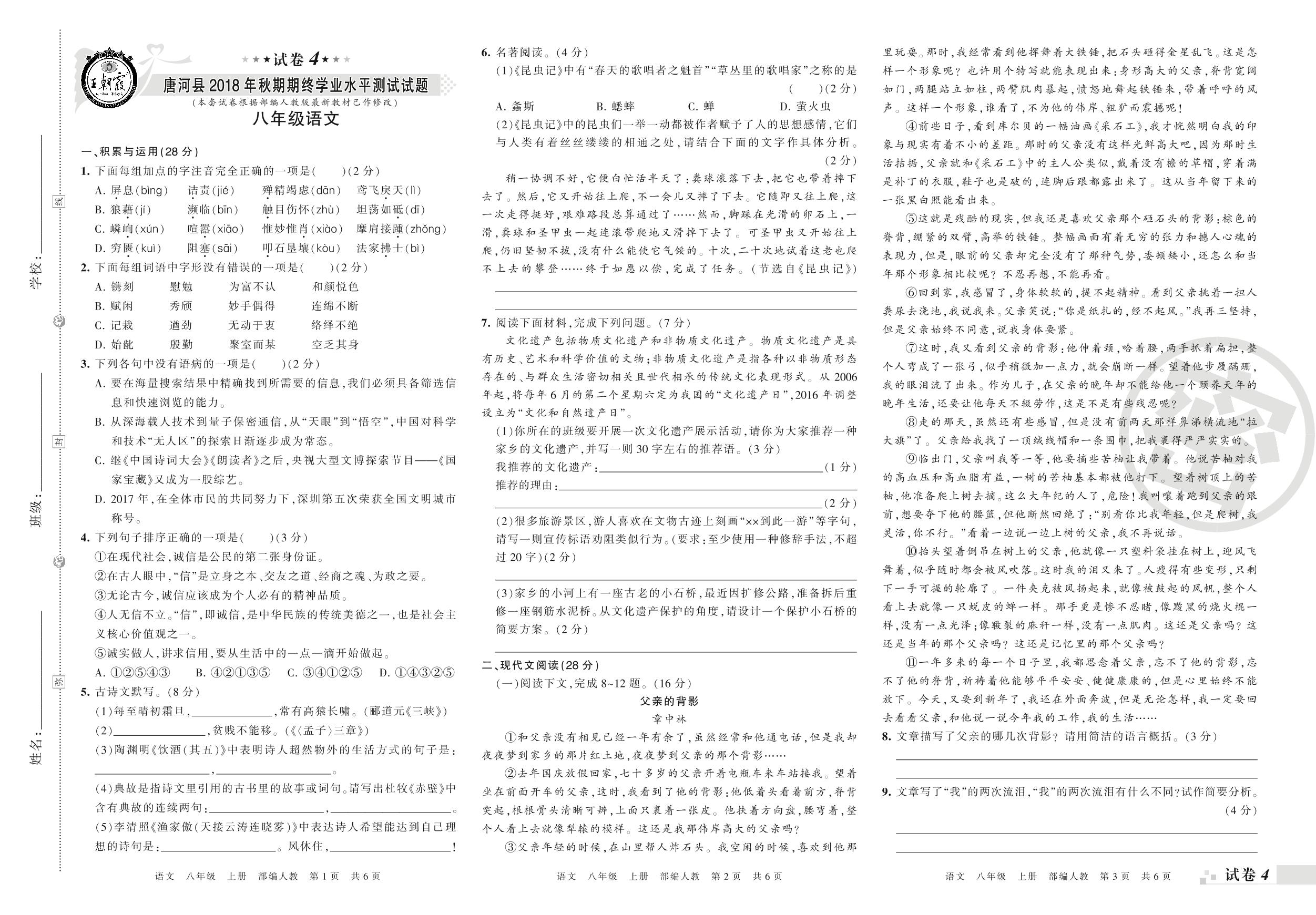 2018-2019学年第一学期南阳市唐河县八年级语文试卷(人教版)【4】