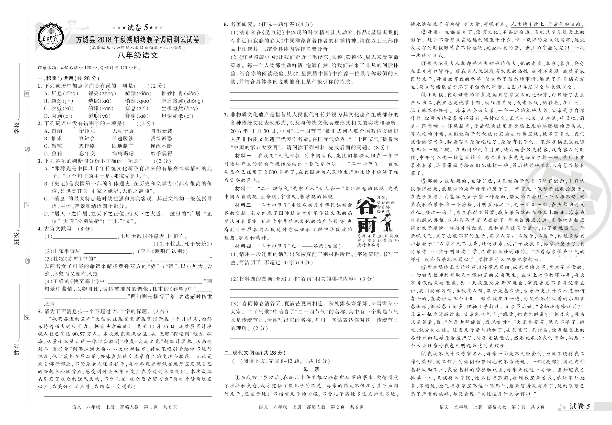 2018-2019学年第一学期南阳市方城县八年级语文试卷(人教版)【5】