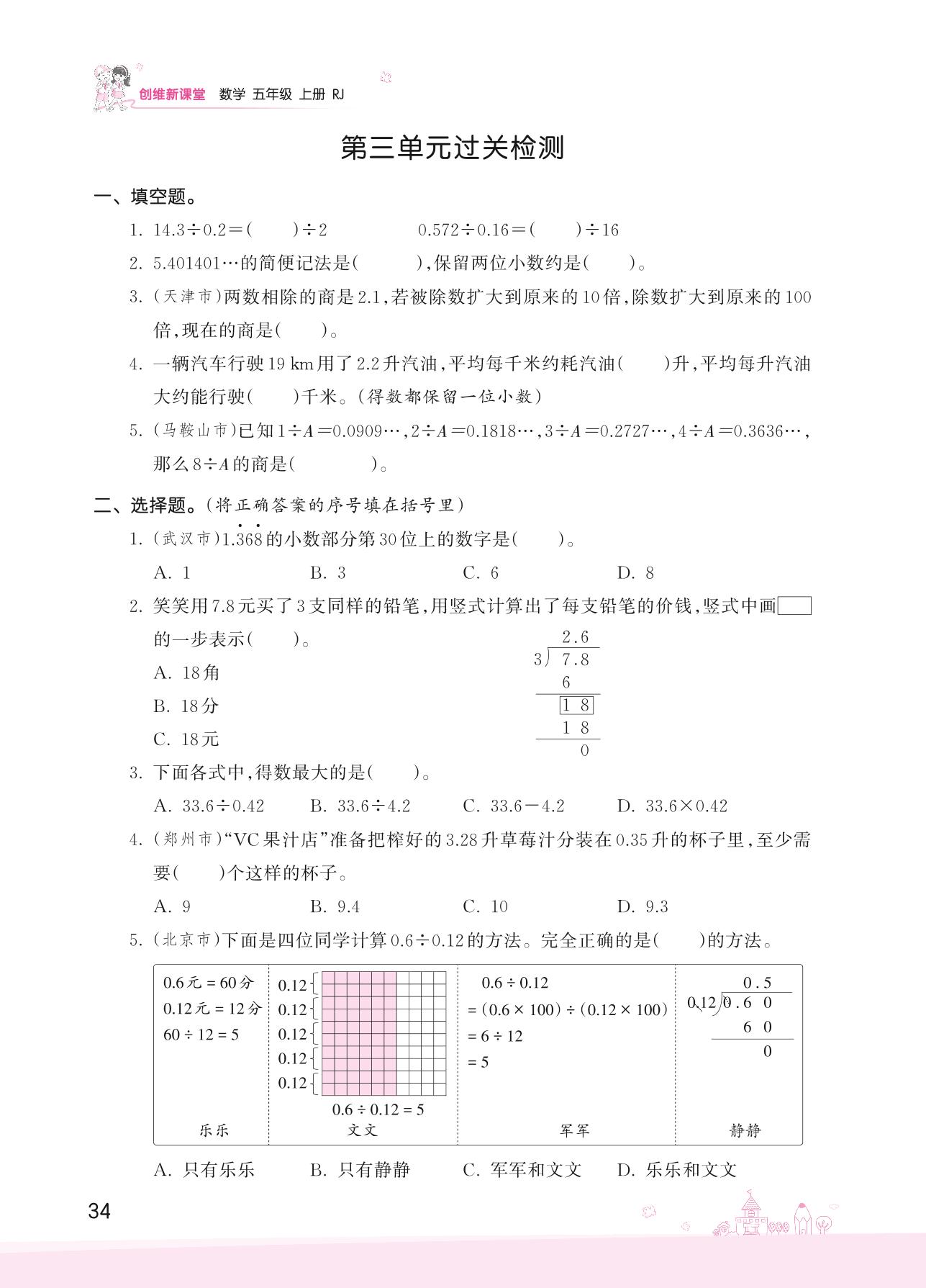 2022上册五年级数学人教版 三 小数除法——第三单元过关检测