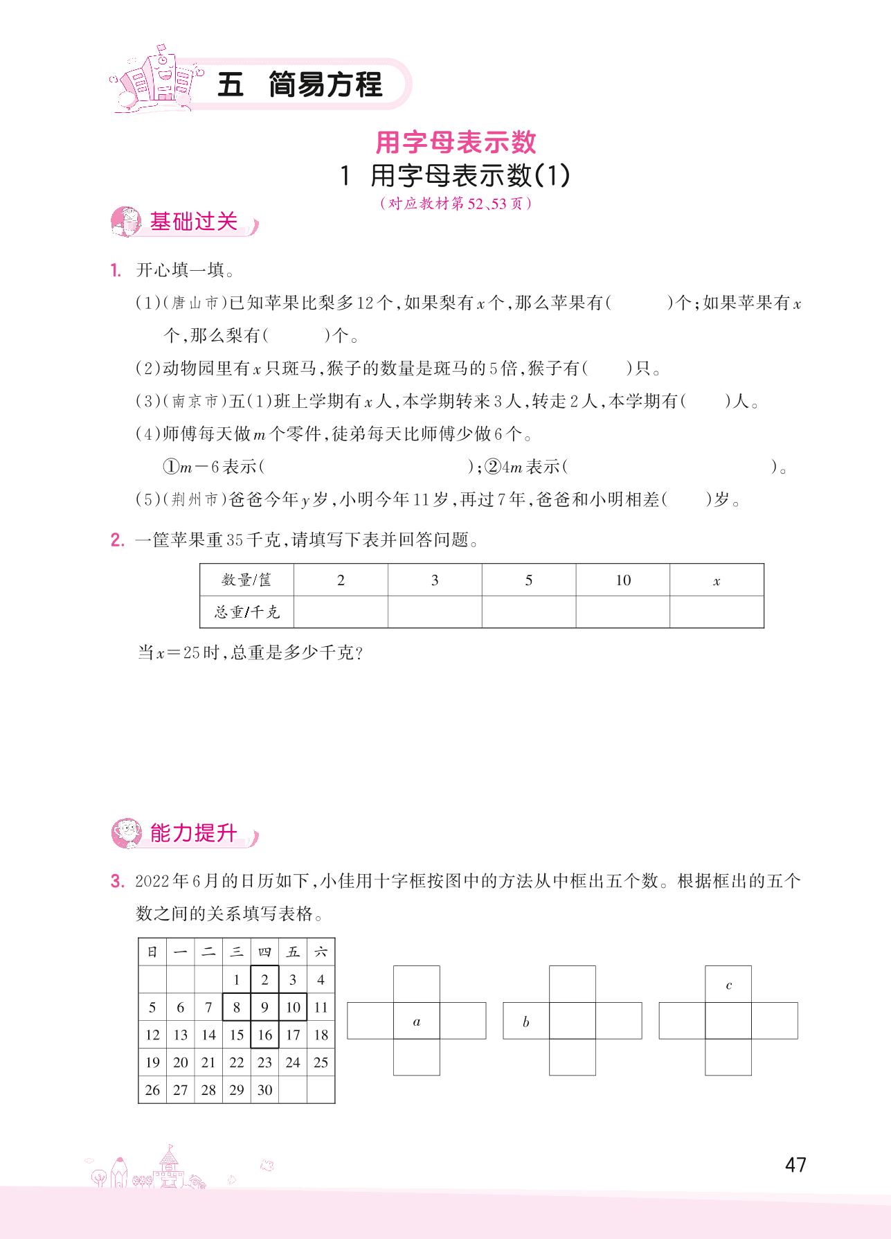 2022上册五年级数学人教版 五 简易方程——1 用字母表示数(1)