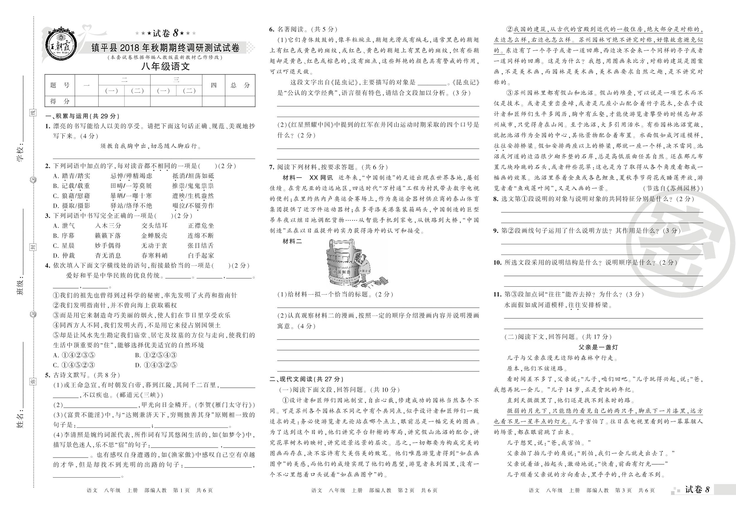 2018-2019学年第一学期南阳市镇平县八年级语文试卷(人教版)【8】