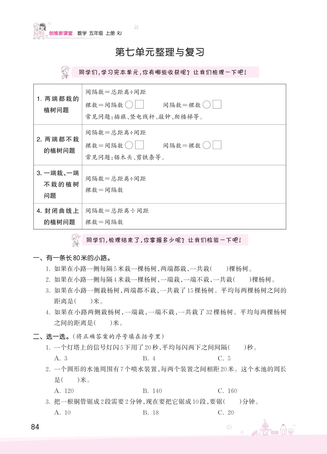 2022上册五年级数学人教版 七 数学广角 植树问题——第七单元整理与复习