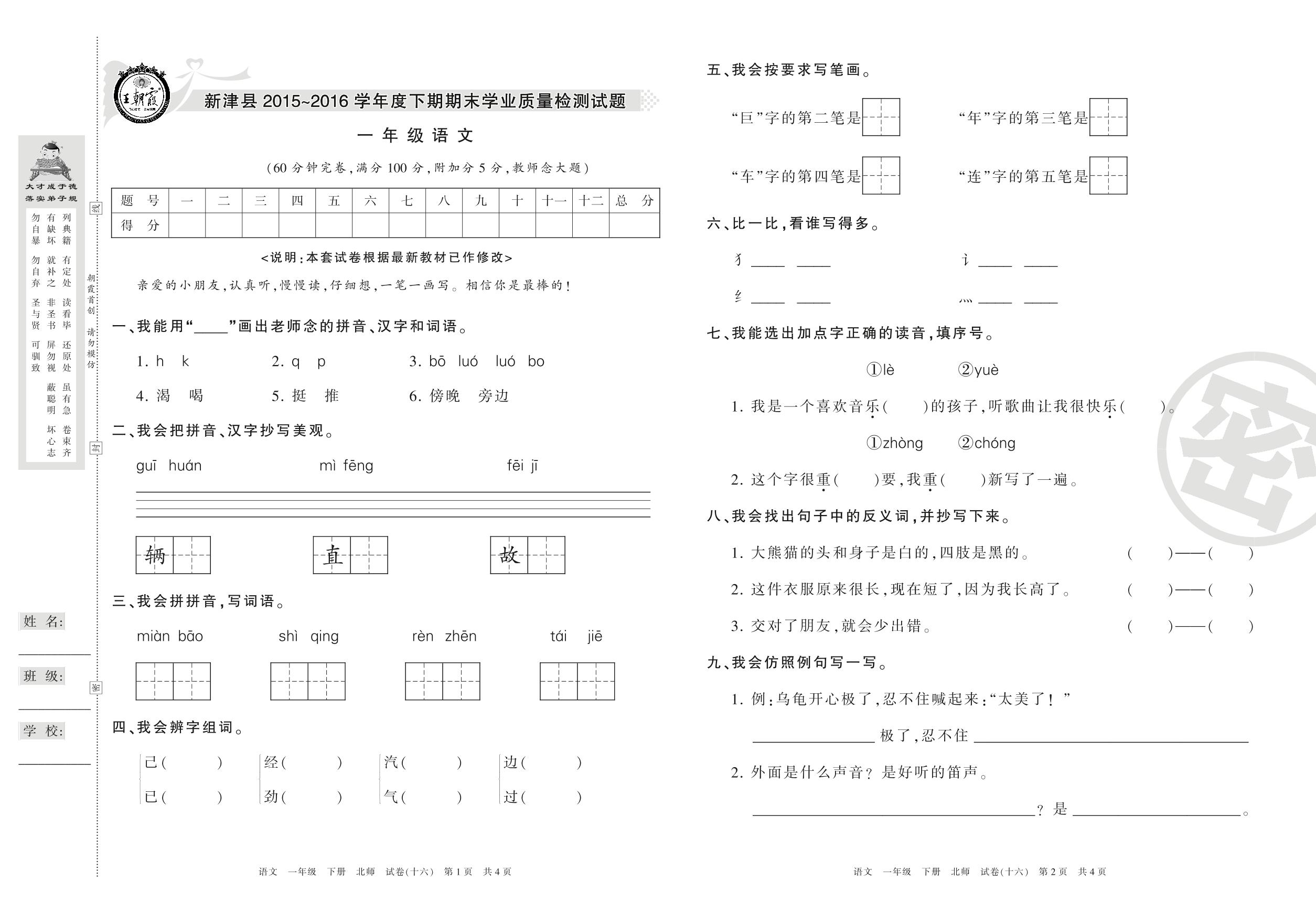 2015-2016学年第二学期成都市新津县一年级语文试卷(北师版)【16】