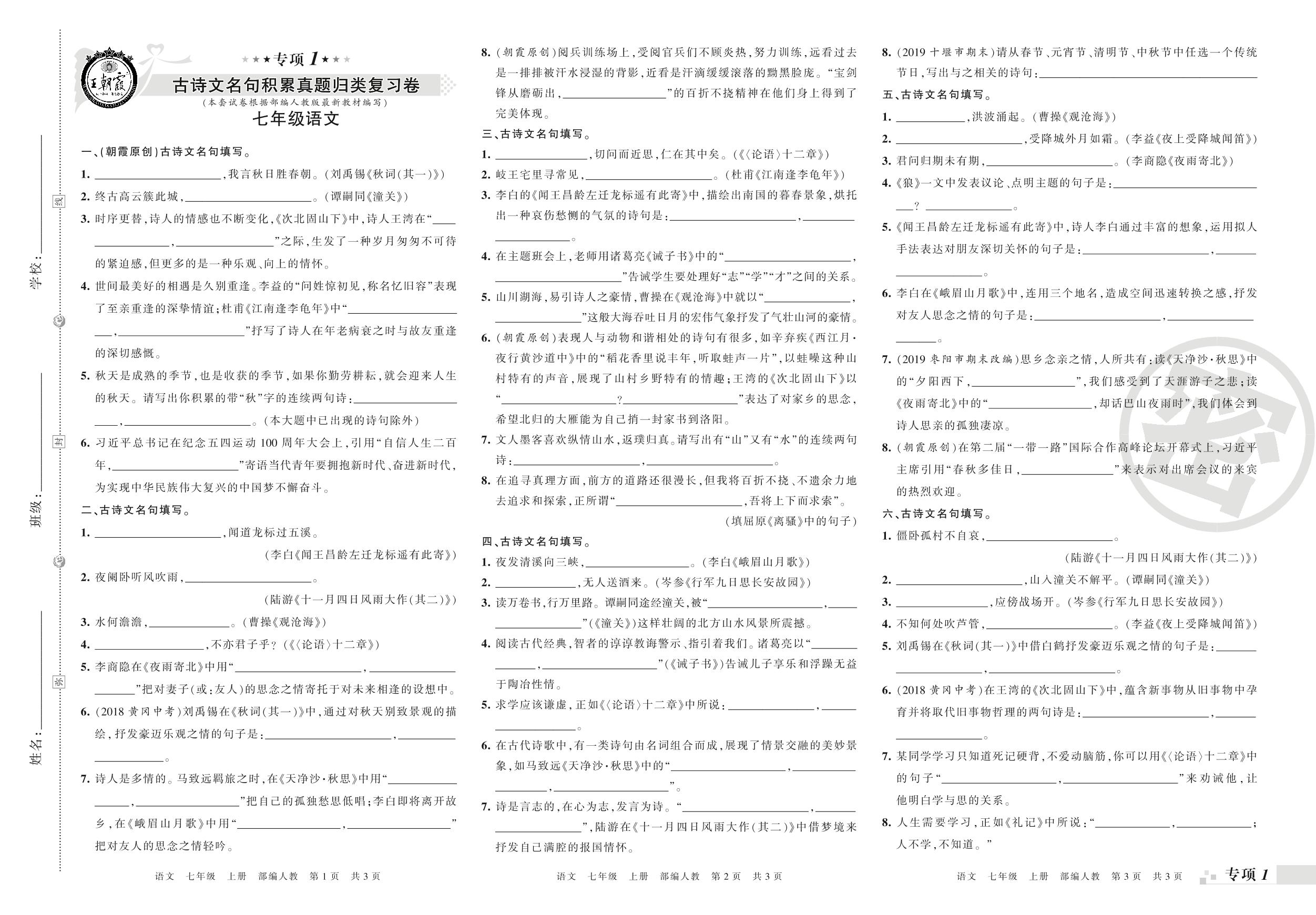 王朝霞期末专项卷——古诗文名句积累、语文基础知识真题归类复习七年级上册语文(人教版)_R21080234404【0】