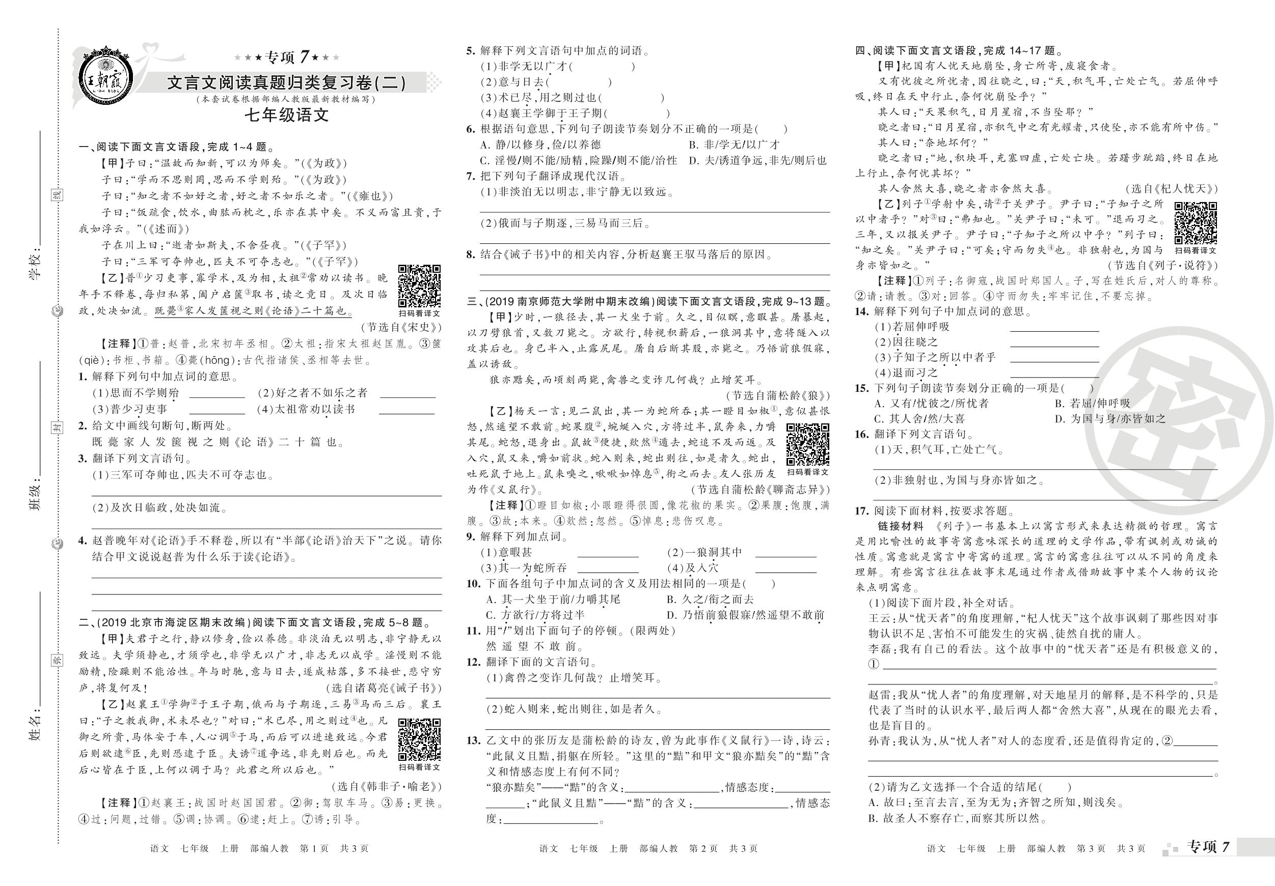 王朝霞期末专项卷——文言文阅读、古诗词阅读真题归类复习七年级上册语文(人教版)_R21080234424【0】