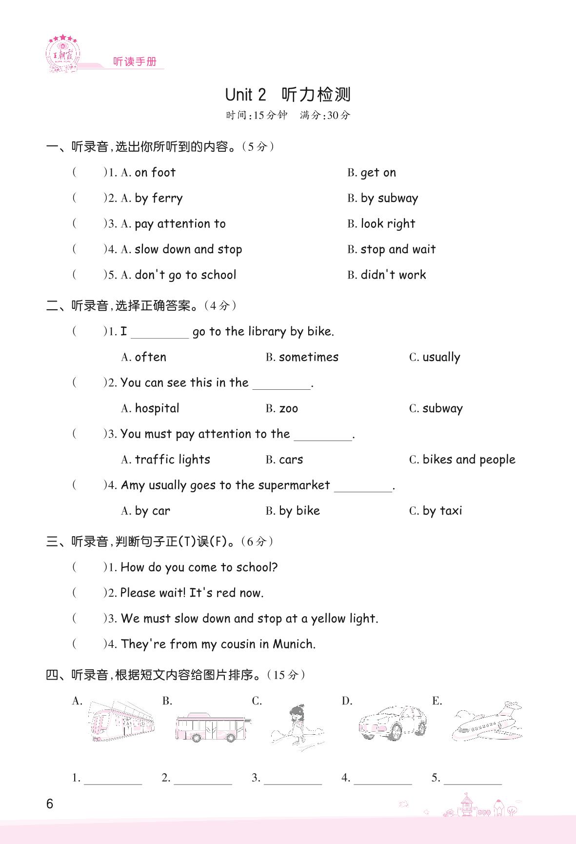 2022上册六年级英语人教PEP版 Unit 2 Ways to go to school—听力检测