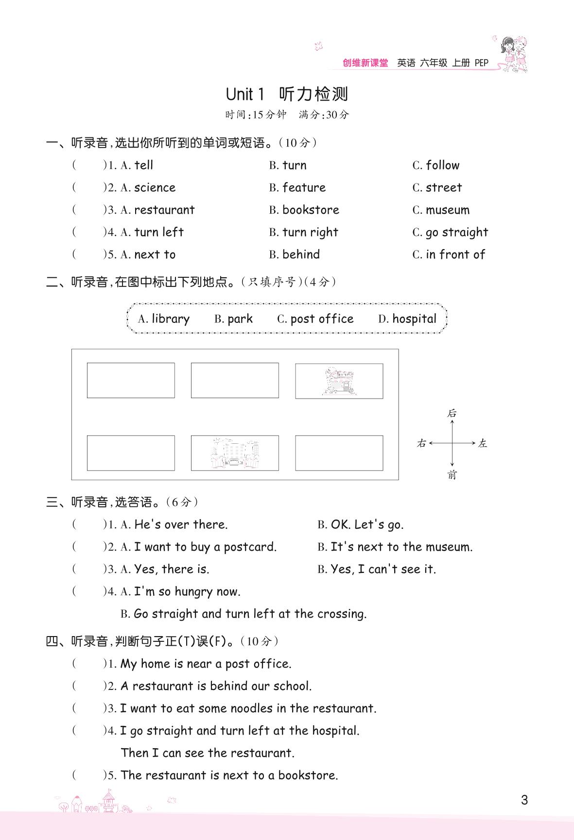 2022上册六年级英语人教PEP版 Unit 1 How can I get there?—听力检测