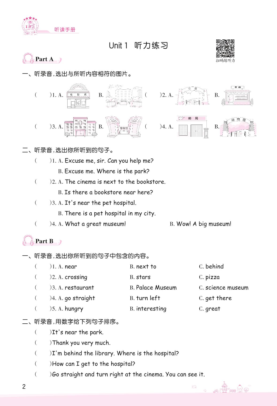 2022上册六年级英语人教PEP版 Unit 1 How can I get there?—Part A、Part B 听力练习