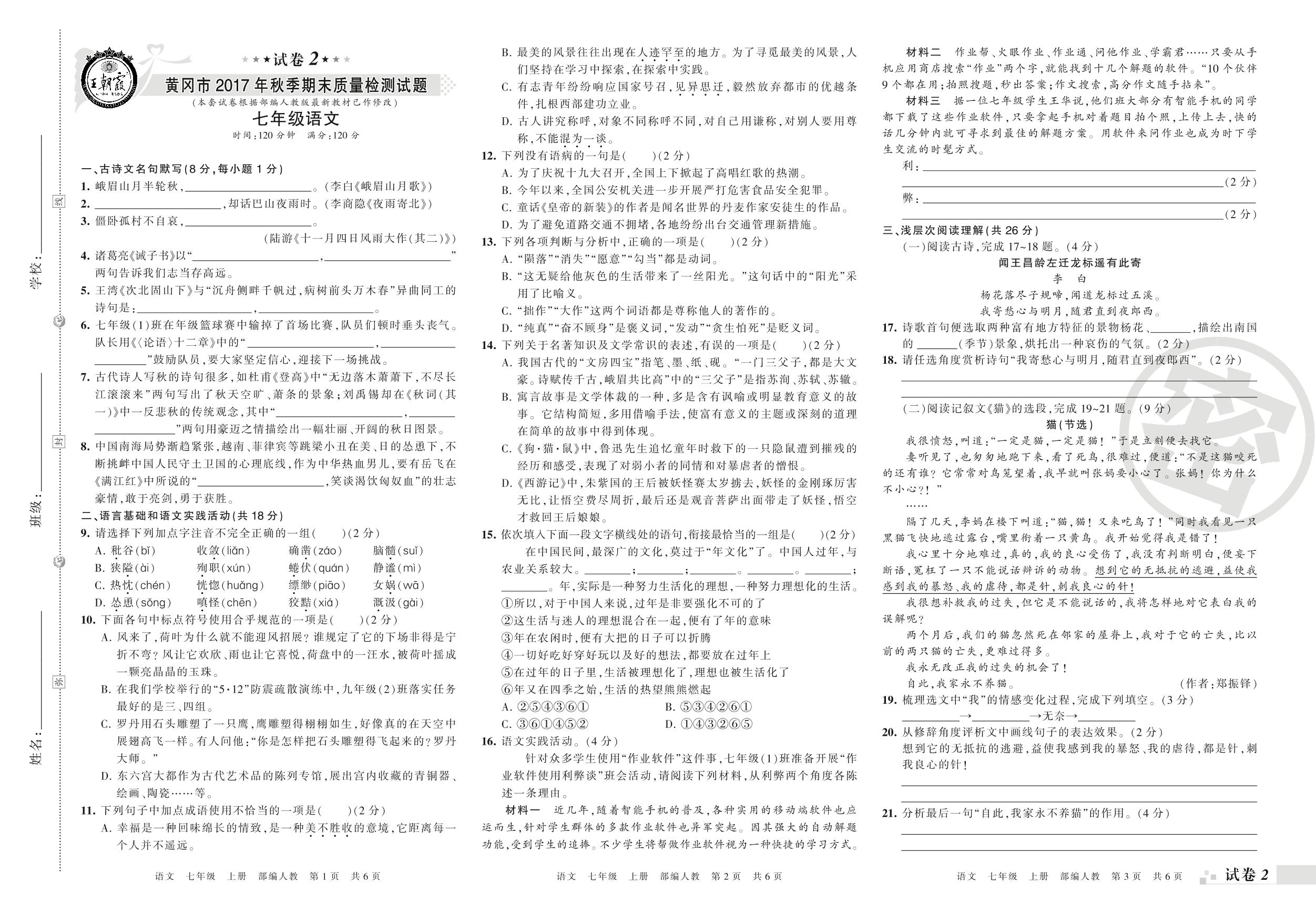 2017-2018学年第一学期黄冈市七年级语文试卷(人教版)【2】