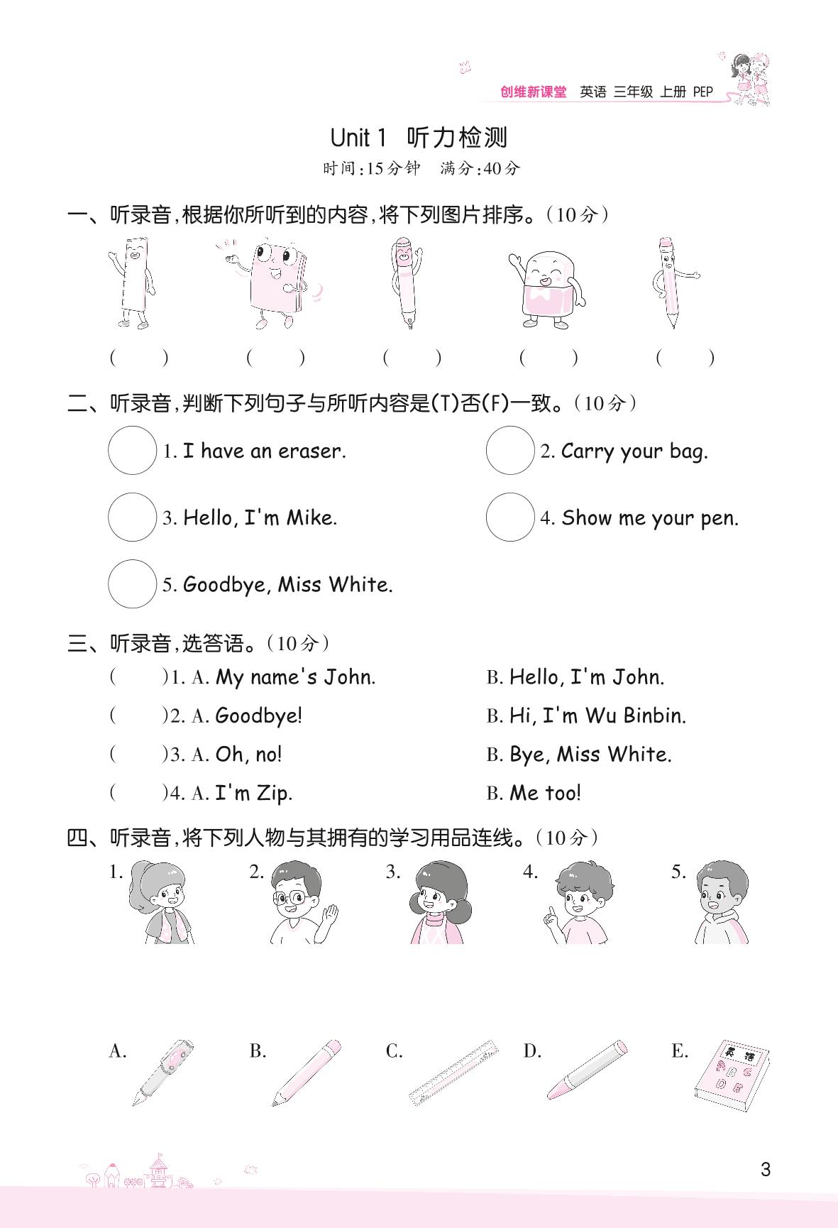 2022上册三年级英语人教PEP版 Unit 1 Hello!—听力检测