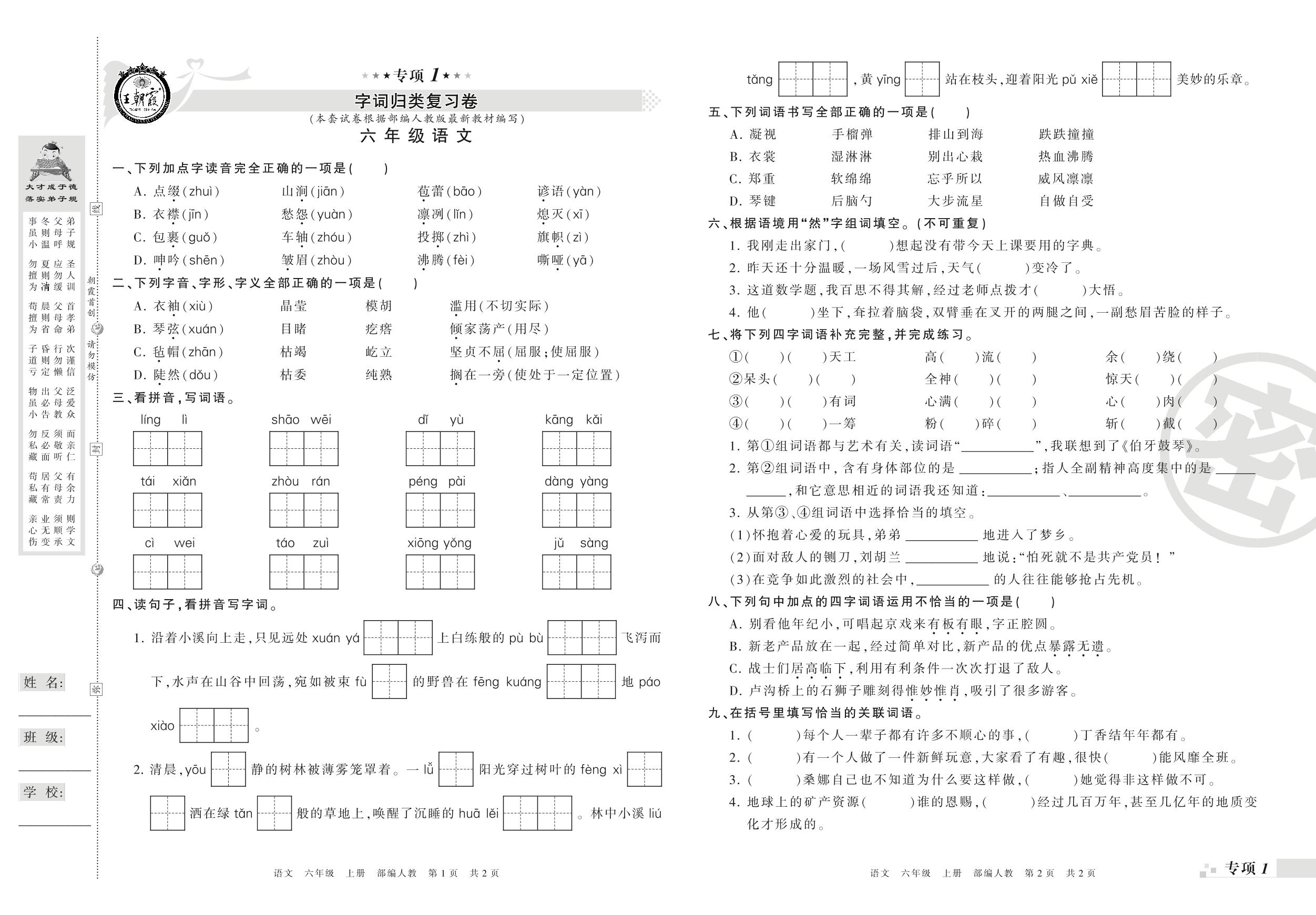 王朝霞期末专项卷——字词、句子与口语交际真题归类复习六年级上册语文(人教版)_R21080234539【0】
