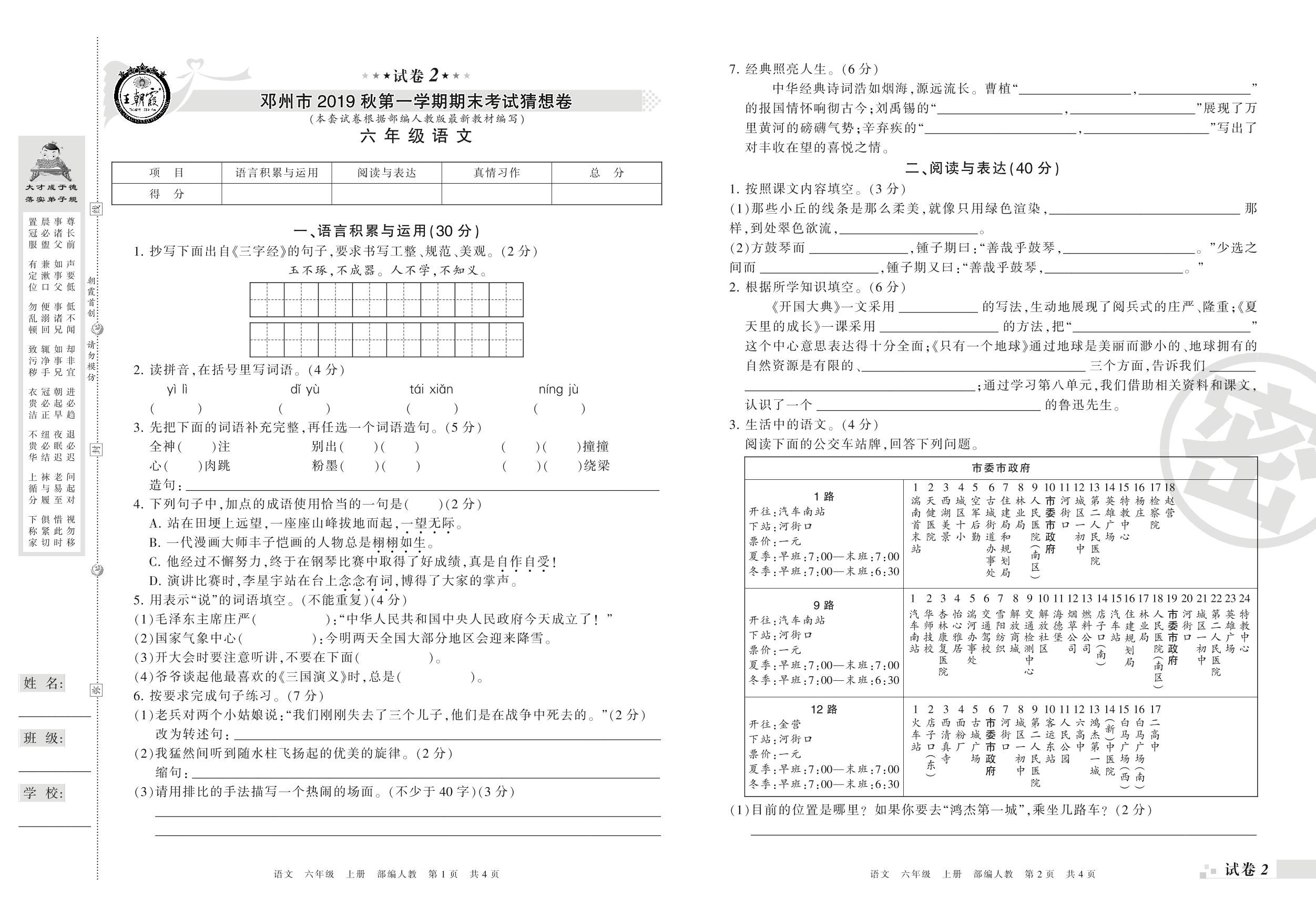 2019-2020学年第一学期邓州市猜想卷六年级语文试卷(人教版)【2】