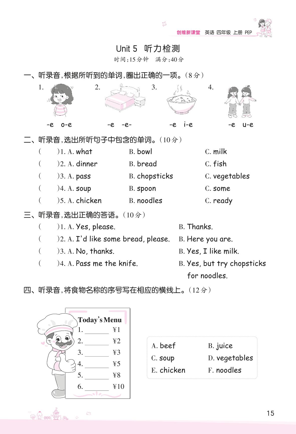 2022上册四年级英语人教PEP版 Unit 5 Dinner’s ready—听力检测