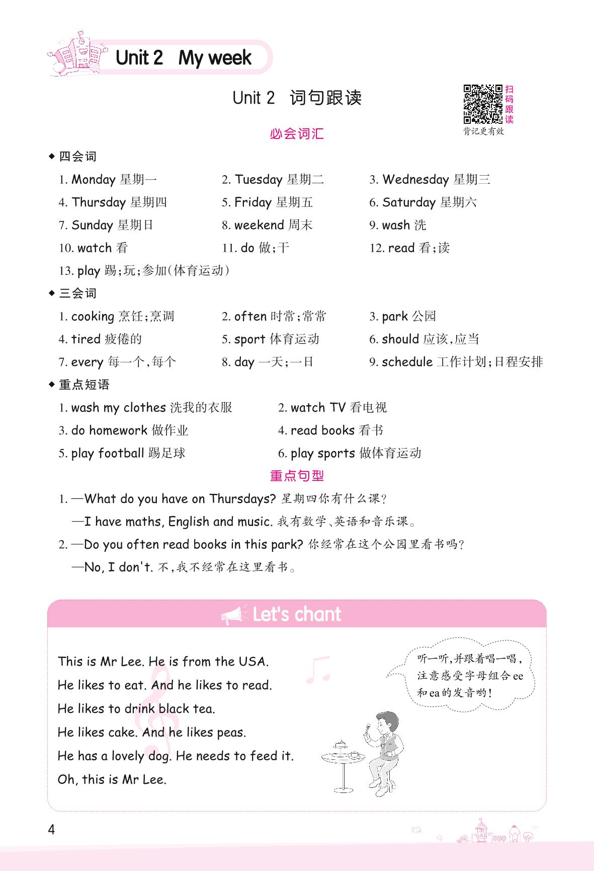 2022上册五年级英语人教PEP版 Unit 2 My week—词句跟读