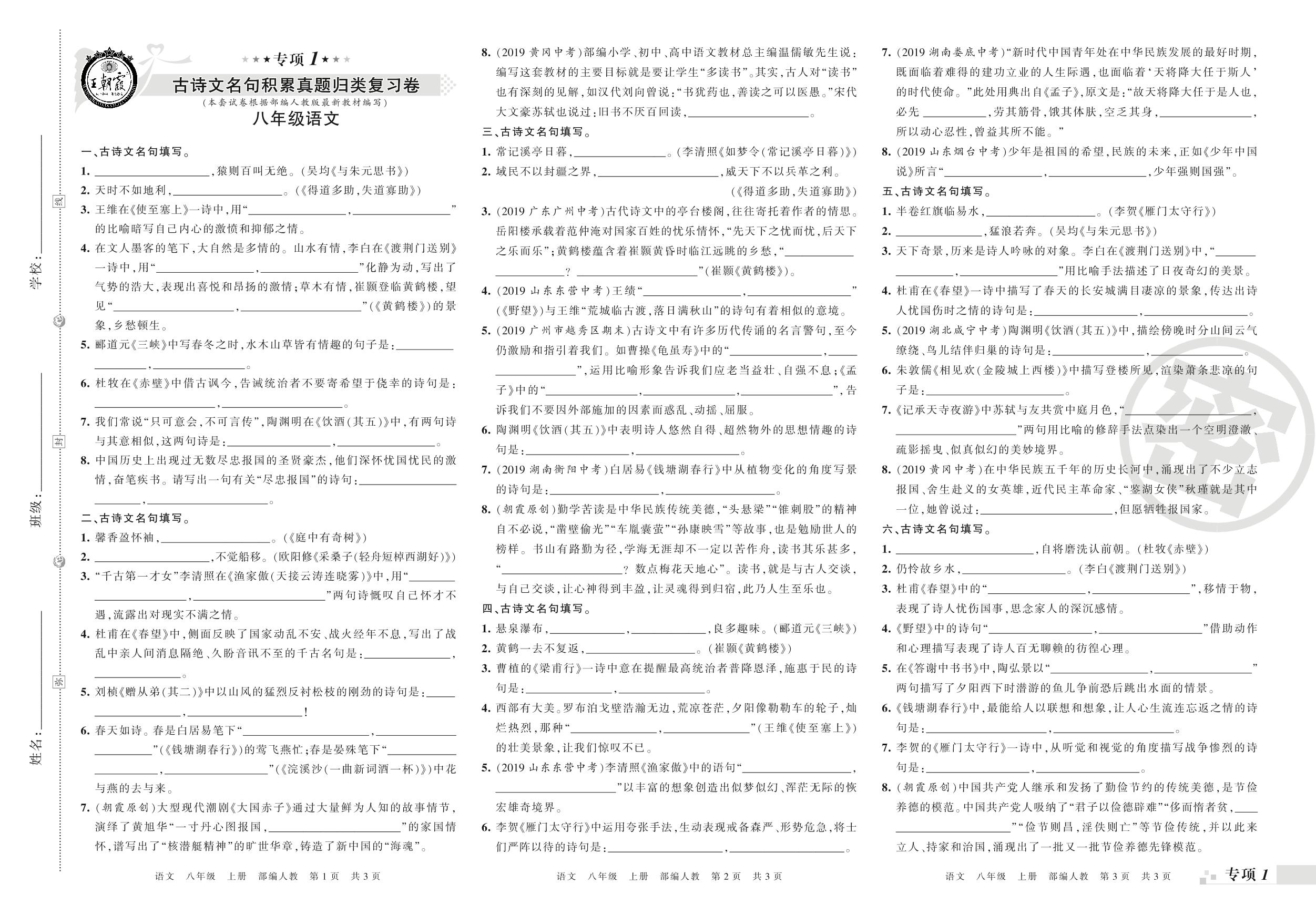 王朝霞期末专项卷——古诗文名句积累、语文基础知识真题归类复习八年级上册语文(人教版)_R21080234620【0】