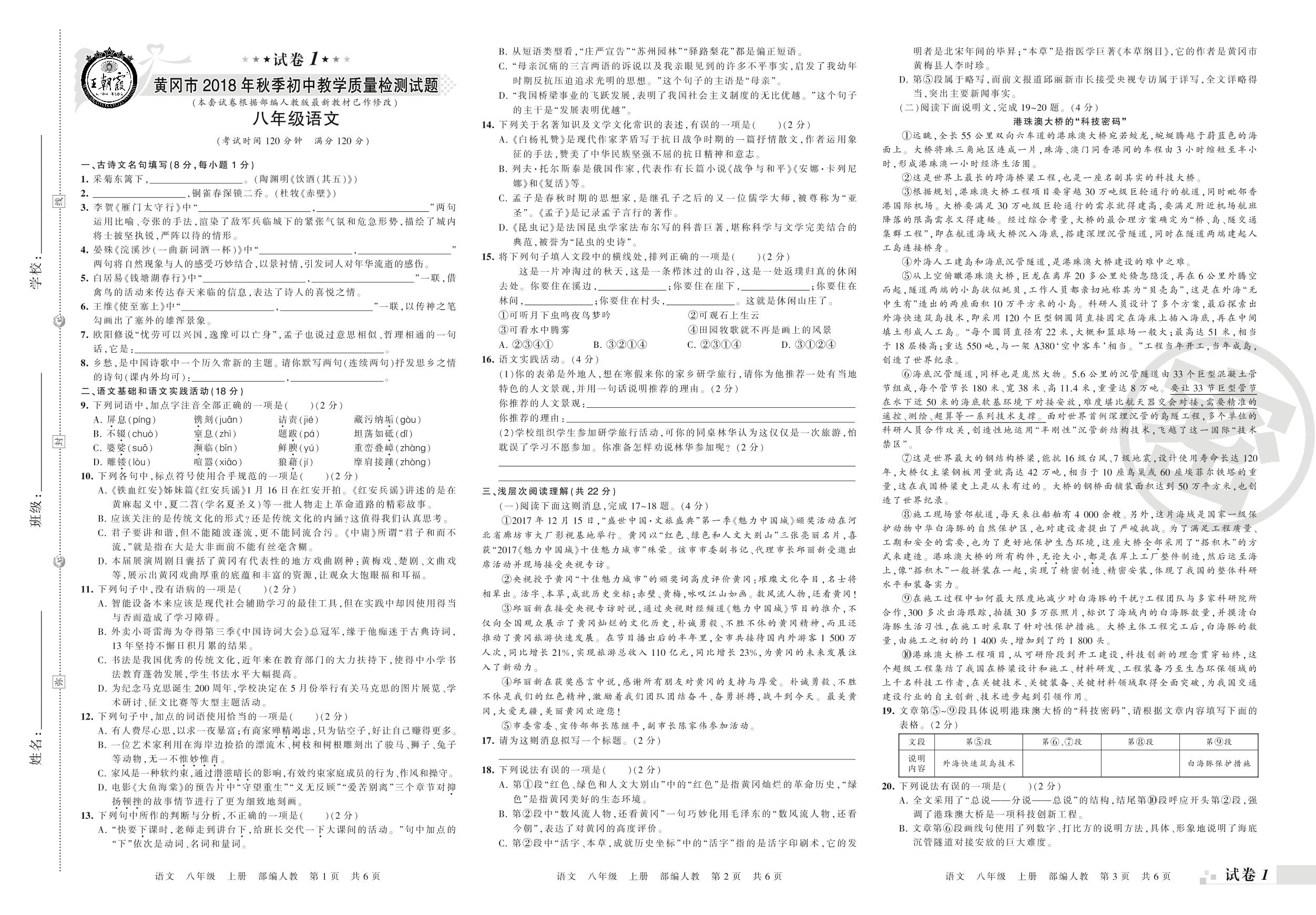 2018-2019学年第一学期黄冈市八年级语文试卷(人教版)【1】
