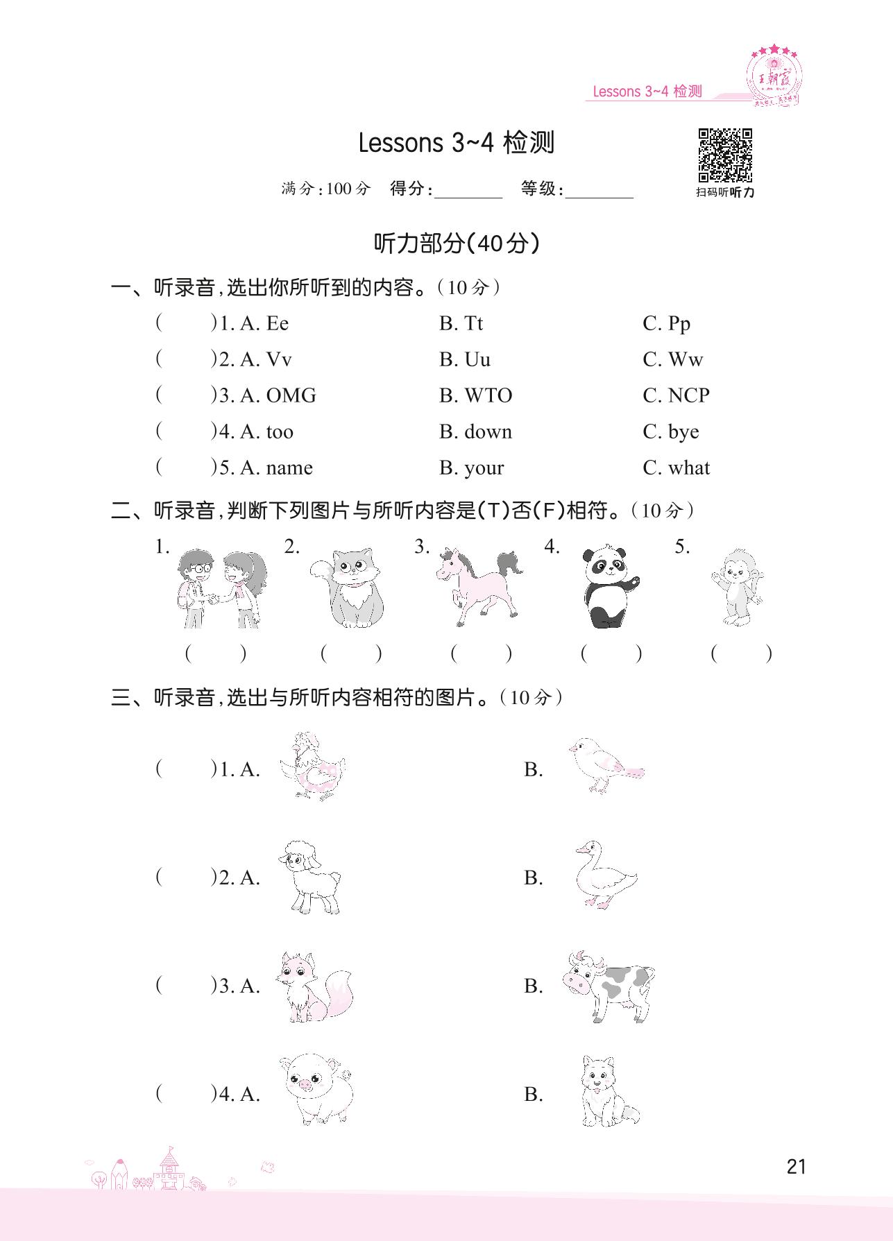 2022上册三年级英语科普版 Lessons 3~4 检测