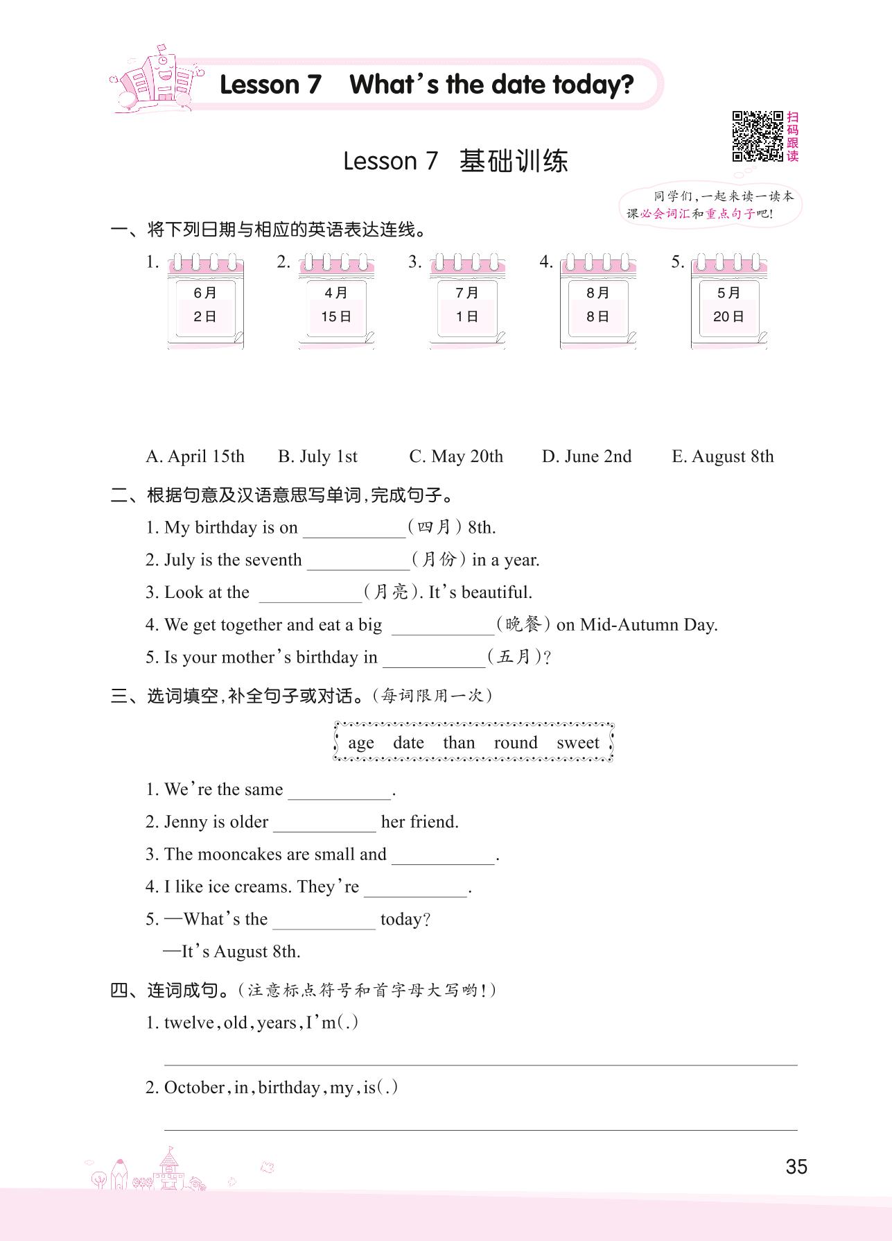 2022上册六年级英语科普版 Lesson 7 基础训练