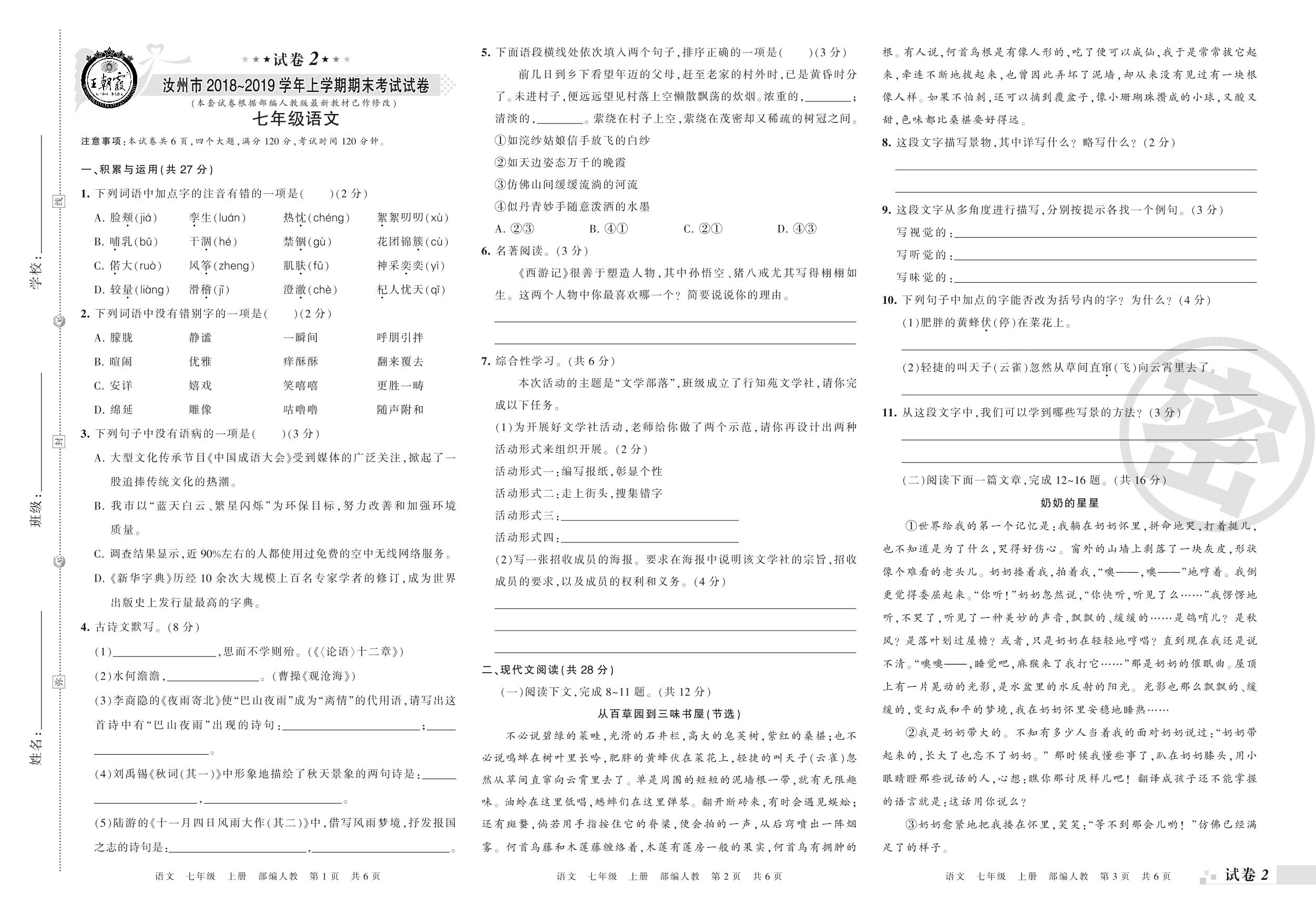 2018-2019学年第一学期汝州市七年级语文试卷(人教版)【2】