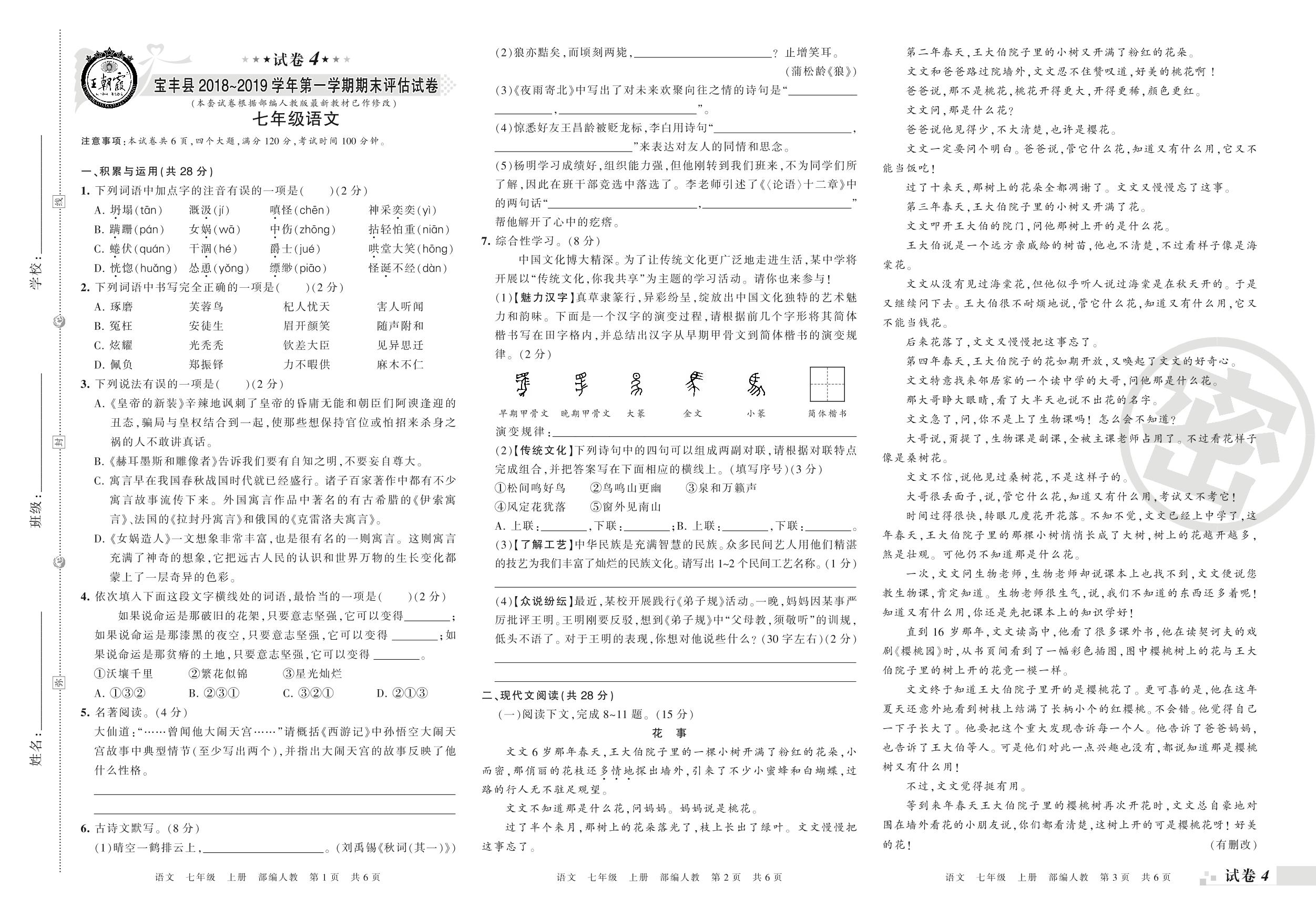 2018-2019学年第一学期平顶山市宝丰县七年级语文试卷(人教版)【4】