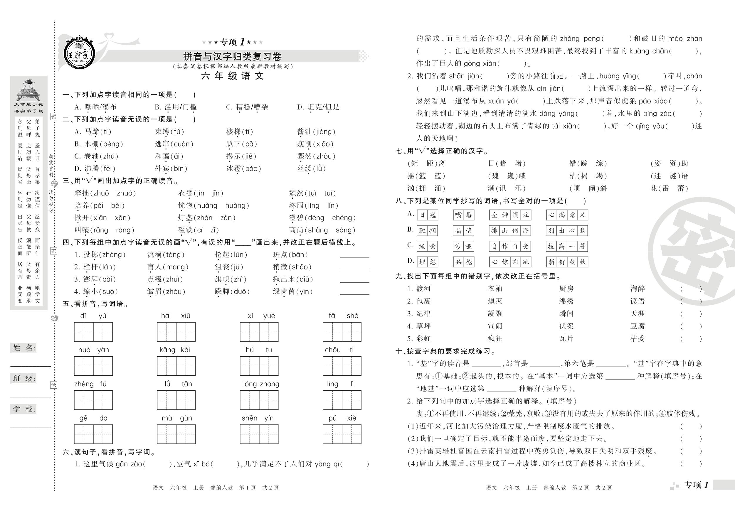 王朝霞期末专项卷——拼音与汉字、词语归类复习六年级上册语文(人教版)_R21080234941【0】